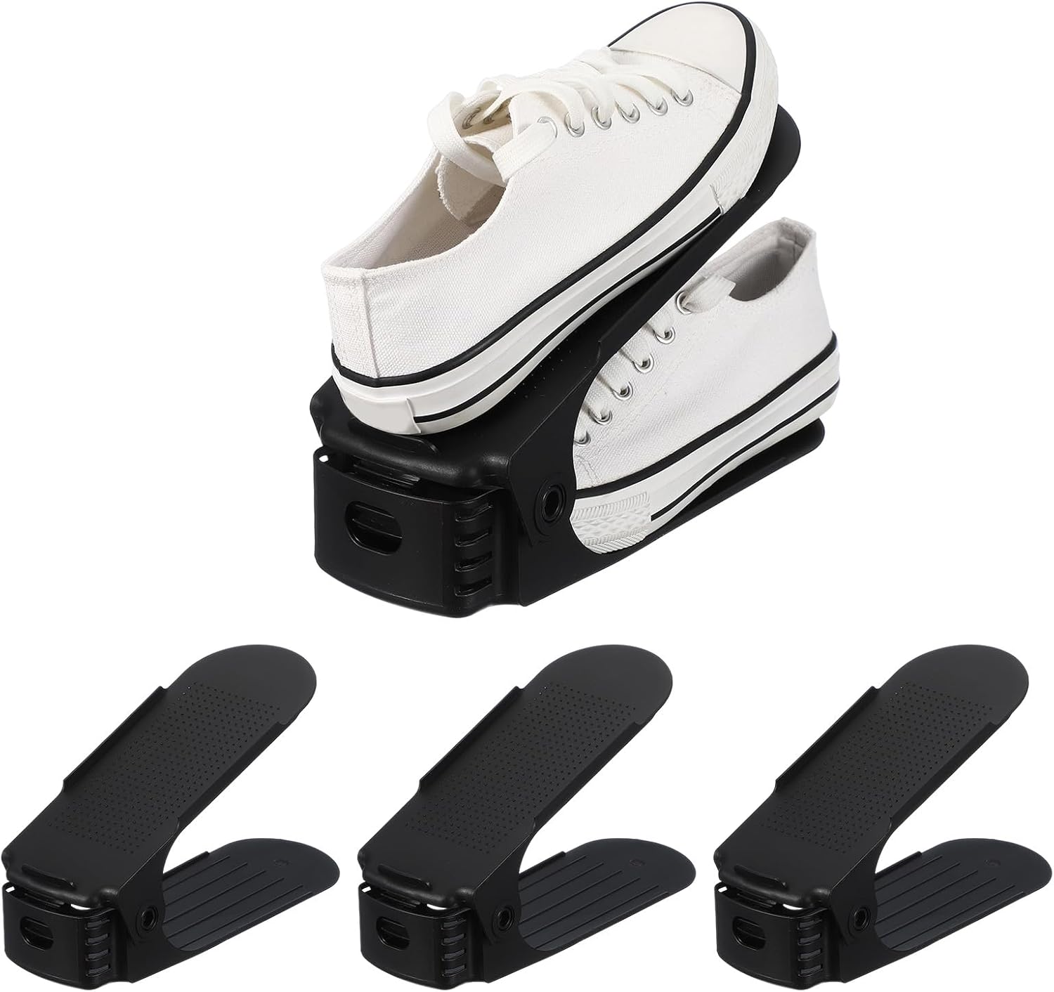 Description:PE Material: Our shoe slots organizer is made of PP plastic, which is long-lasting and not easily deformed under frequent use, maintaining structural integrity while being lightweight and convenient for your daily shoe storage needs.Space-Saving Design: The double-layer structure of the shoe stacker maximizes vertical storage capacity, instantly saving 50% of closet space. This efficient design organizes shoes in pairs, transforming shoe racks into tidy storage systems.Anti-Slip Design: Each shoe organizer is equipped with raised edges and non-slip bumps, holds the top shoe in place, and effectively preventing slips and falls, and ensures your shoes remain neatly organized.Adjustable & Versatile Use: The shoe slot organizer is designed to accommodate a wide range of footwear, from children's shoes and sneakers to sandals and flats. Perfect for organizing closets, entryways, and storage racks.Specification:Color: WhiteMaterial: PP PlasticProduct Dimensions: 25 x 9 x 18 cm / 9.84 x 3.54 x 7.09 Inch (LxWxH)Package Content: 4 Pcs x Shoe Space Saver