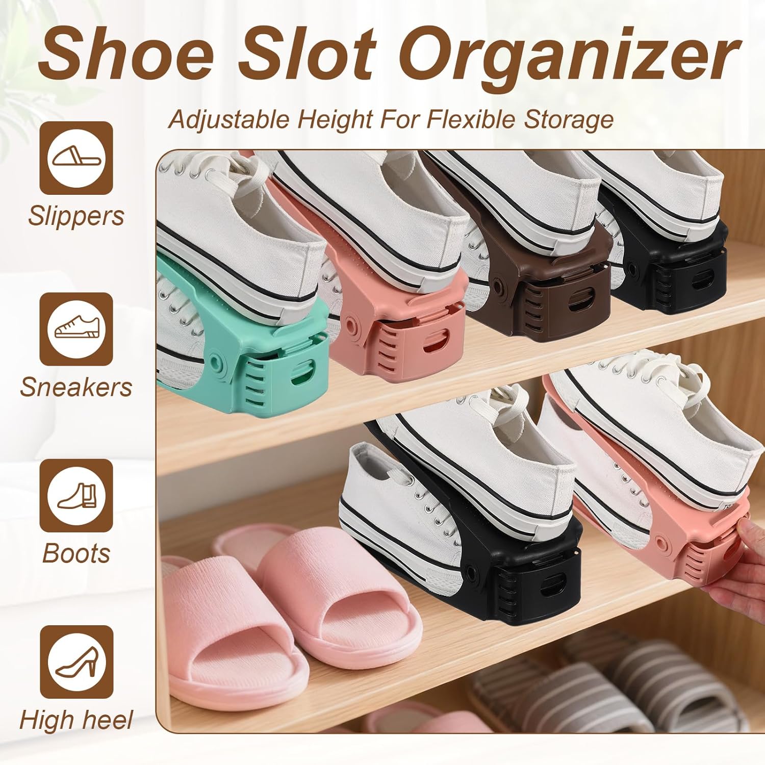 • Adjustable & Versatile Use: The shoe slot organizer is designed to accommodate a wide range of footwear, from children's shoes and sneakers to sandals and flats. Perfect for organizing closets, entryways, and storage racks.