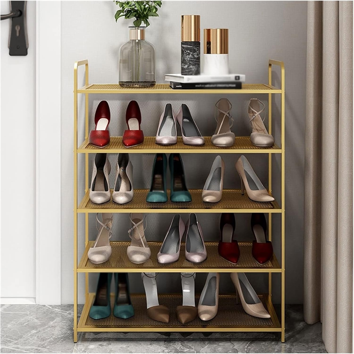 Push-fit metal tubes and plastic connectors, our shoe racks can be easily assembled in minutes, no complicated tools required Product name: shoe rack Product material: iron Product size: 60*27*64 cm/23.6*10.6*25.1 inch Product color: gold Applicable scenarios: living room, bedroom, office, study, lounge, kitchen, balcony, corridor, etc. Notice: 1. Due to the difference of light and shooting angle, there may be slight chromatic aberration, please understand. 2. Please confirm the color before purchasing. 3. The product only has a shoe rack, nothing else except the shoe rack 4. Manually measure the size, there may be some small errors, please refer to the actual product, thank you. 5. Do not use hard cleaning tools to clean the product, so as not to scratch the surface of the product. 6. Welcome to share and feedback, we can provide you with better products and services. 7. If you find any problems with our products, please feel free to contact us via email, we will solve these problems as soon as possible