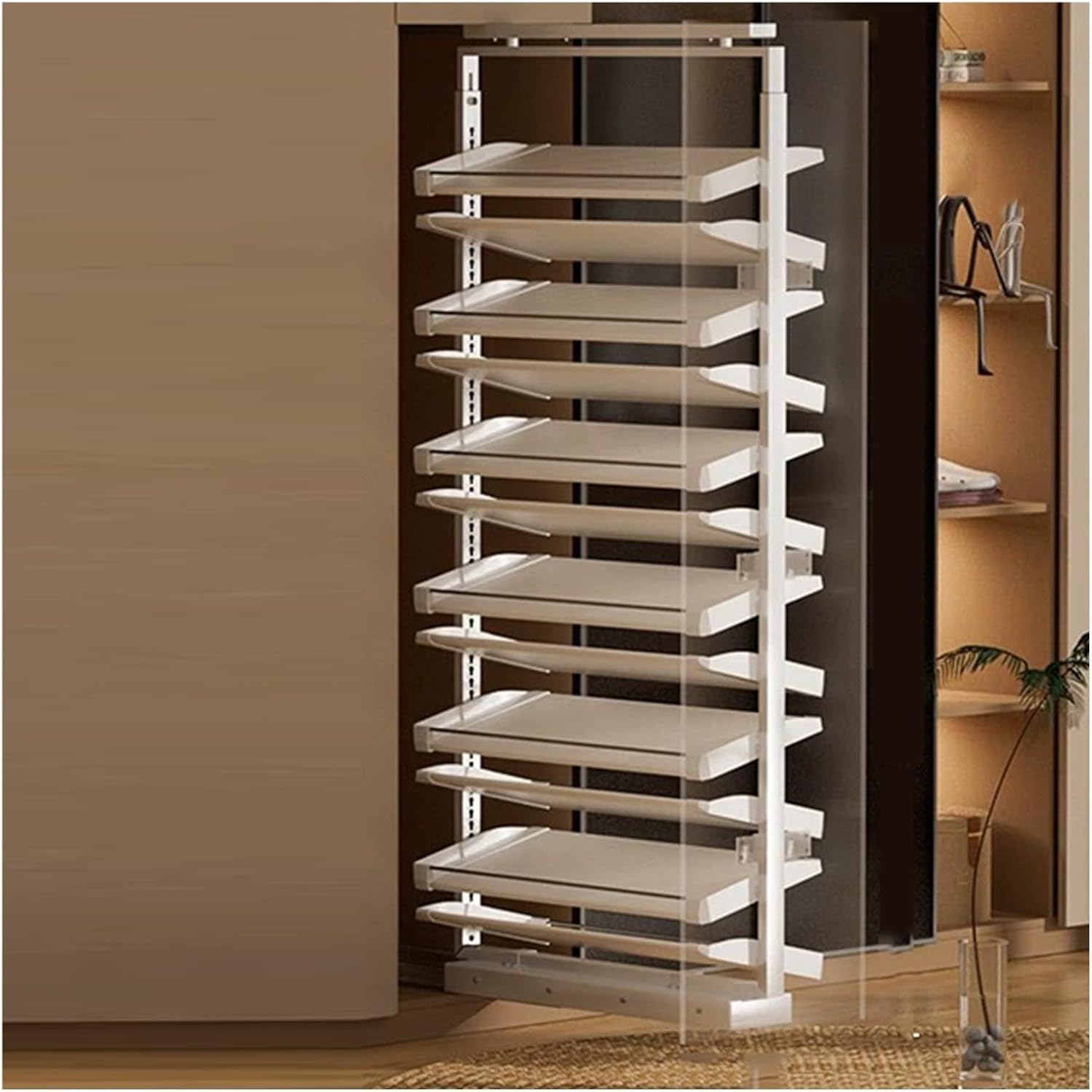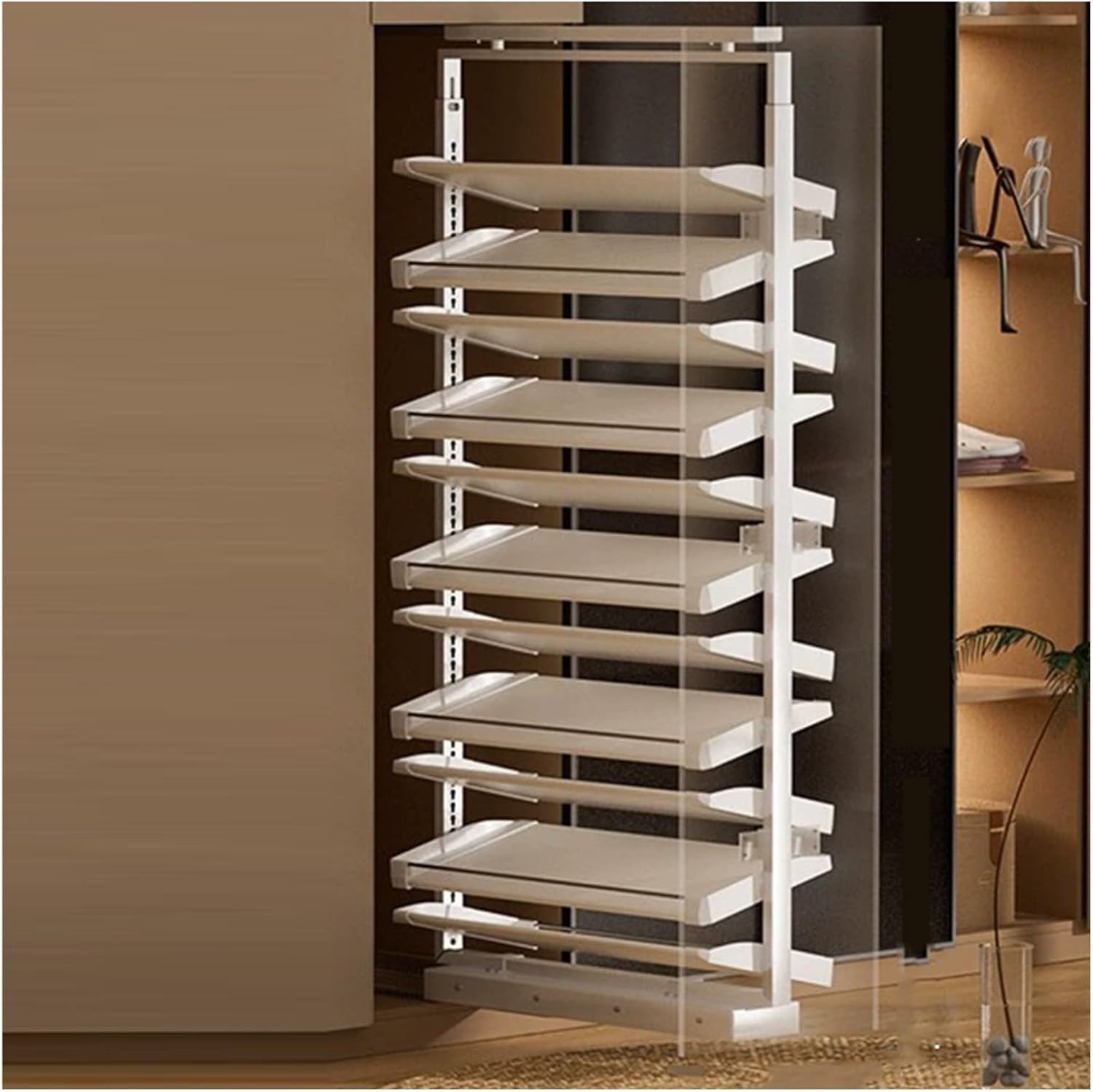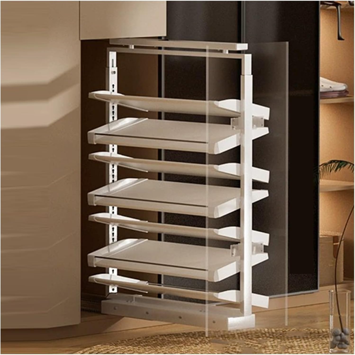 • SMOOTH AND SILENT: The rotating shoe rack features damped slides for effective shock absorption and cushioning, ensuring smooth, stable, and quiet rotation. Find your shoes quickly without bending over or rummaging through cluttered piles