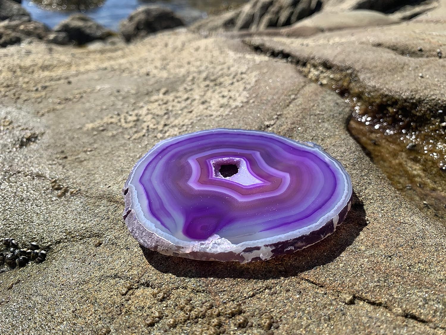 Add bold elegance to your space with this 4-piece Purple Agate Coaster set, featuring genuine Brazilian crystal slices in deep purple hues. Hand-polished and rimmed with shimmering gold, each coaster is unique in banding and tone. Sized at 3.5–3.75″ and fitted with clear rubber bumpers, they protect furniture from heat, scratches, and spills. Ideal for modern-boho, spiritual, or upscale interiors, these coasters also serve as decorative pieces for tables or walls. Beautifully packaged for gifting—perfect for birthdays, weddings, housewarmings, or anyone who loves crystals and intentional living.