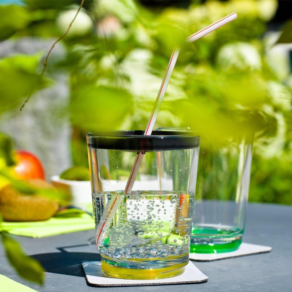 Innovative drinking glass with integrated magnet. Stackable mould. Material: high-quality polycarbonate, unbreakable, food-safe, looks like real glass, high temperature resistant and completely neutral in taste even with hot drinks. Set includes 2 glasses + 2 coasters. Country lock: France, capacity: 250 ml, dimensions: ø 8, 1 x 10 cm, weight: 130 g.