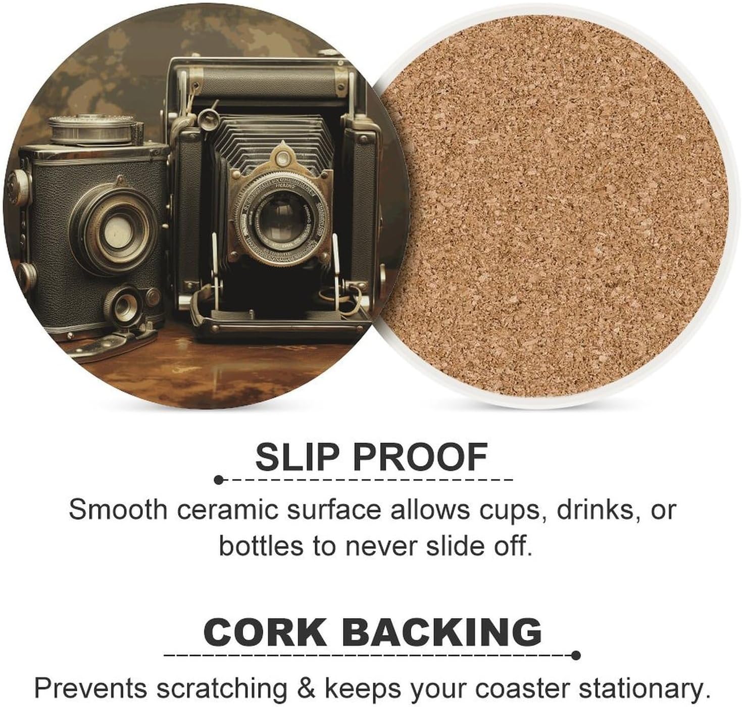 Transform your daily hydration into a stylish and protective ritual with our Cute Ceramic Coasters with Cork BottomDrink Coasters for Home Cup Mats for Table Rustic Coasters Round Coasters Unique Coasters Vintage Coasters Art Teacher Gifts Round Drink Coasters for Hot Cups Funny Coasters Outdoor Coasters for Patio Table Waterproof Bar Coasters Non-Slip Table Coasters Absorbent Coasters Ceramic Car Coasters for Cup Holders Ceramic Cup Holder Coaster for Car Cool Coasters Pretty Coasters White Wine Coasters Housewarming Gifts CoastersSuitable Size:Heat resistant coasters for drinks arr crafted from ceramic and finished with a natural cork base, each coaster is as practical as it is sustainable. The 4.1-inch round size is perfectly proportioned to sit under a variety of glassware - from your favorite coffee mug and ceramic teacup to tall glasses of iced tea or bottles of beer.Double Protection:The heat-resistant ceramic top acts as a shield, guarding your cherished wood tables, kitchen countertops, and office desks against hot beverages, unsightly water rings, and condensation . Meanwhile, the soft, non-slip cork bottom plays a dual role: it prevents the tea coasters from sliding around when you reach for your drink, and it ensures your furniture remains free from scratches and scuffs.Multi Purpose: Whether you're decorating a coffee table in the living room, adding a functional touch to a home office, or setting up a bar cart for entertaining, these decorative coasters are the perfect blend of utility and subtle style.Material: Ceramic & CorkSize: 4.1 inches (Diameter)Care: Wipe clean with a damp cloth.Designed for the modern home, these heat resistant cup mats blend functionality with minimalist aesthetics to keep your surfaces pristine.