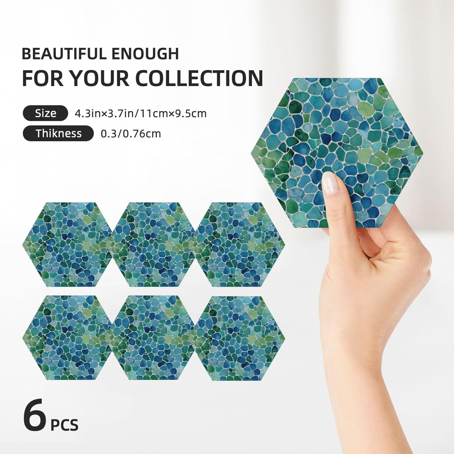 Product Name: DCEHGEW Ceramic Drink CoastersMaterial Type: Ceramic with cork bottomSize: Round: 4.1 x 4.1 inches, Square: 3.9 x 3.9 inches, Hexagon: 4.3 x 3.7 inchesPattern: Blue green pattern About Our Ceramic Absorbent Coasters:Product Features - Crafted from high-quality ceramic, these coasters are odorless and eco-friendly. Their superior absorbency keeps your surfaces dry by quickly soaking up spills from coffee, cola, and other beverages within 10-15 seconds.Applicable Scenarios - Perfect for adding a stylish touch to your kitchen, living room, bar, hotel, or restaurant. These coasters are an ideal present for birthdays, Mother's Day, Father's Day, Valentine's Day, anniversaries, housewarming celebrations, or Christmas.Accessory Structure - Each set includes 6 ceramic coasters with cork bottoms, accompanied by a sleek black metal stand for organized and aesthetic storage. Choose from three different shapes to suit your style and needs.Washing Instructions - Easily clean these coasters with water or a damp cloth.Special NoteDue to different measurement methods, a deviation of up to 0.3 cm in size is considered normal.Please Note:The product images are for reference only. Actual products may vary slightly due to production factors such as batch differences and machine settings. Minor variations in color, position, and size are normal and not considered defects. Thank you for your understanding!Customer Service:We want to make sure you have an amazing experience with us. Please contact us with any feedback you may have. We love to hear from you and usually respond within 12-24 hours.
