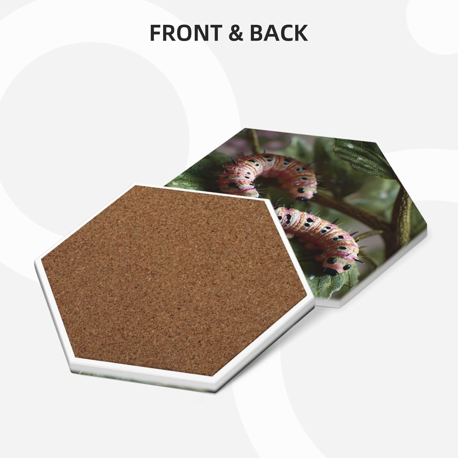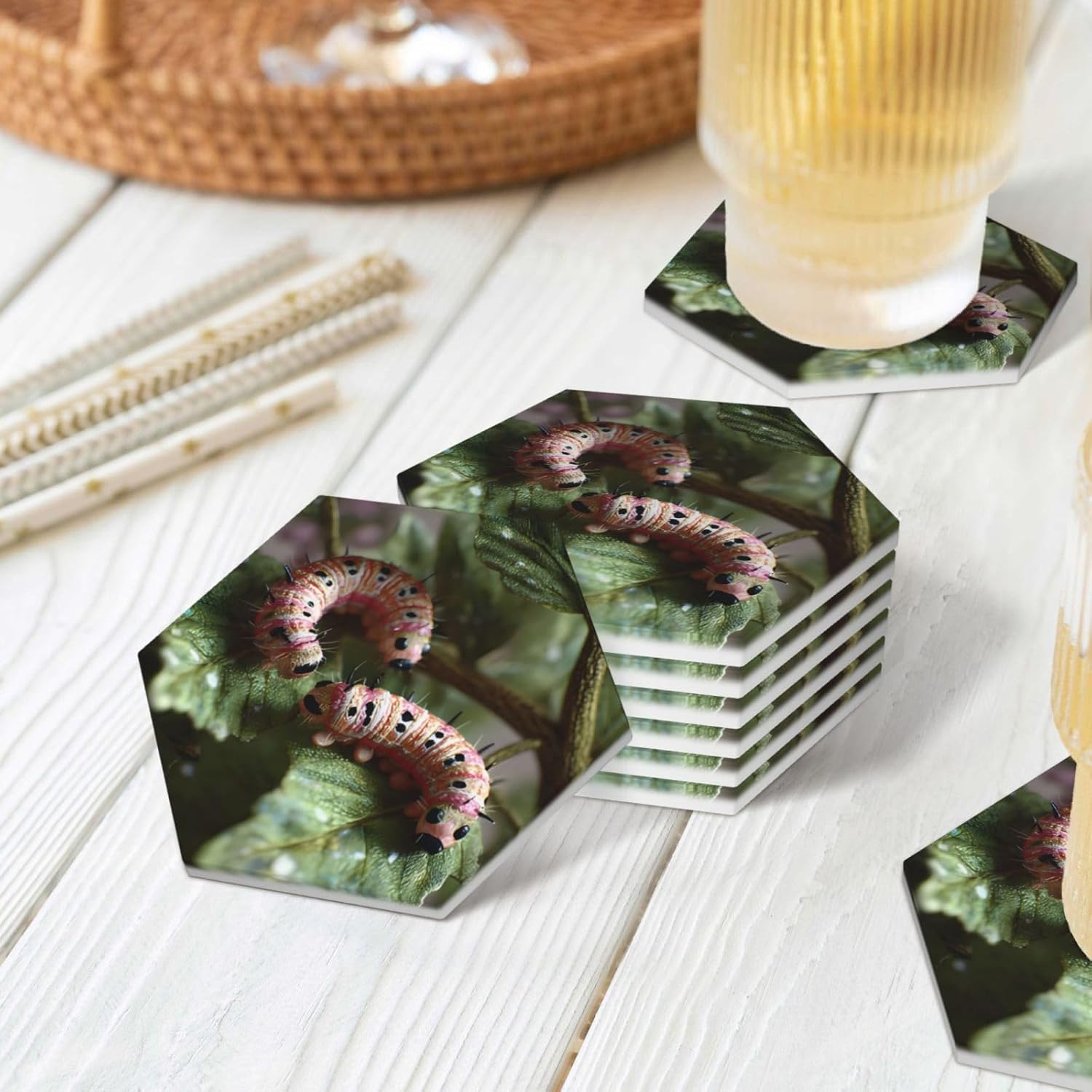 Product Name: DCEHGEW Ceramic Drink CoastersMaterial Type: Ceramic with cork bottomSize: Round: 4.1 x 4.1 inches, Square: 3.9 x 3.9 inches, Hexagon: 4.3 x 3.7 inchesPattern: Caterpillars eating leaves About Our Ceramic Absorbent Coasters:Product Features - Crafted from high-quality ceramic, these coasters are odorless and eco-friendly. Their superior absorbency keeps your surfaces dry by quickly soaking up spills from coffee, cola, and other beverages within 10-15 seconds.Applicable Scenarios - Perfect for adding a stylish touch to your kitchen, living room, bar, hotel, or restaurant. These coasters are an ideal present for birthdays, Mother's Day, Father's Day, Valentine's Day, anniversaries, housewarming celebrations, or Christmas.Accessory Structure - Each set includes 6 ceramic coasters with cork bottoms, accompanied by a sleek black metal stand for organized and aesthetic storage. Choose from three different shapes to suit your style and needs.Washing Instructions - Easily clean these coasters with water or a damp cloth.Special NoteDue to different measurement methods, a deviation of up to 0.3 cm in size is considered normal.Please Note:The product images are for reference only. Actual products may vary slightly due to production factors such as batch differences and machine settings. Minor variations in color, position, and size are normal and not considered defects. Thank you for your understanding!Customer Service:We want to make sure you have an amazing experience with us. Please contact us with any feedback you may have. We love to hear from you and usually respond within 12-24 hours.