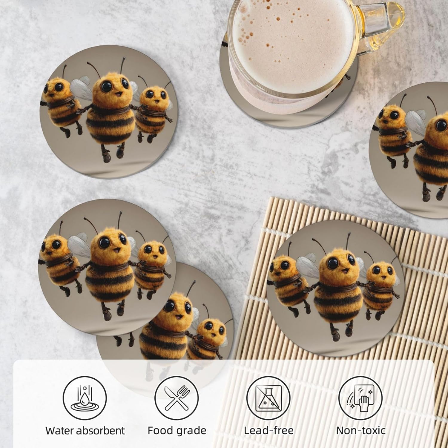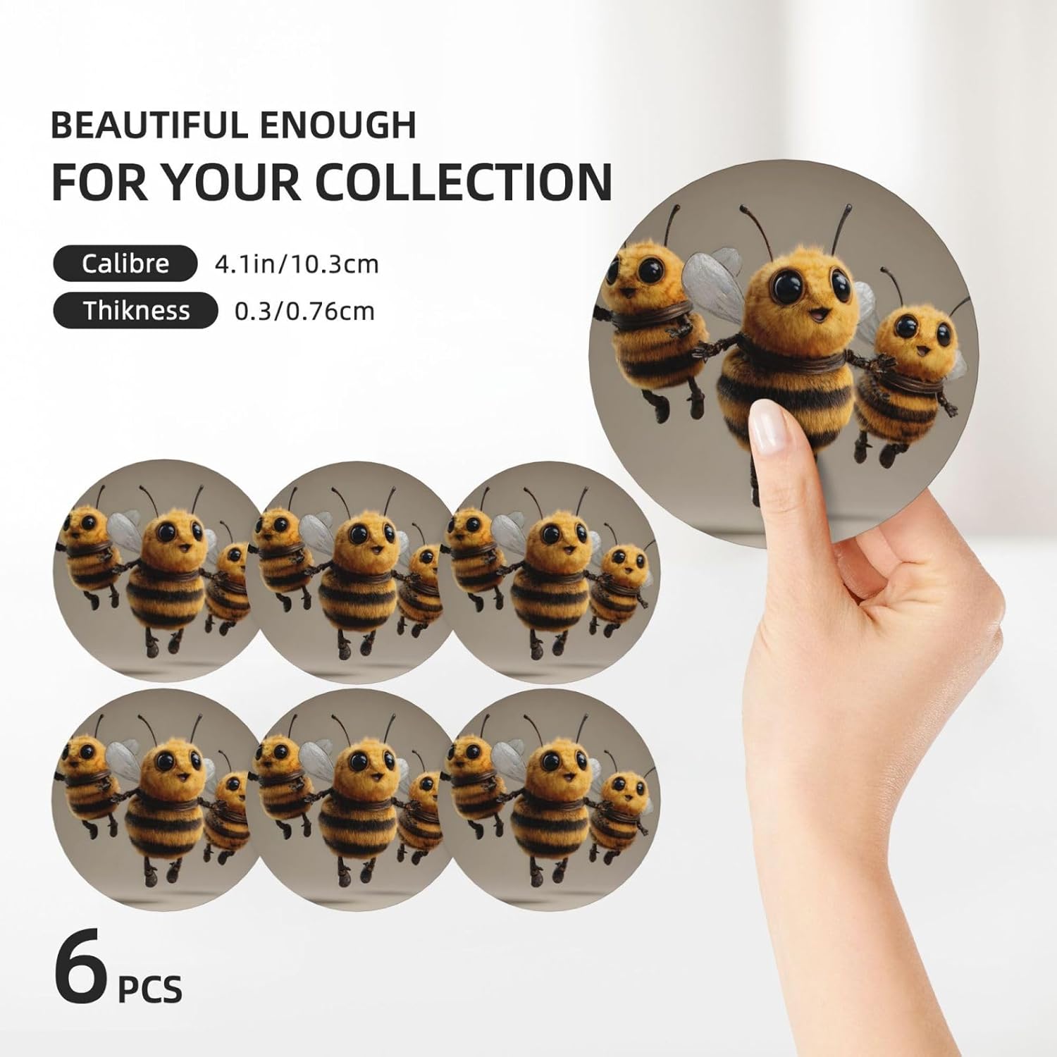Product Name: DCEHGEW Ceramic Drink CoastersMaterial Type: Ceramic with cork bottomSize: Round: 4.1 x 4.1 inches, Square: 3.9 x 3.9 inches, Hexagon: 4.3 x 3.7 inchesPattern: Funny Bees About Our Ceramic Absorbent Coasters:Product Features - Crafted from high-quality ceramic, these coasters are odorless and eco-friendly. Their superior absorbency keeps your surfaces dry by quickly soaking up spills from coffee, cola, and other beverages within 10-15 seconds.Applicable Scenarios - Perfect for adding a stylish touch to your kitchen, living room, bar, hotel, or restaurant. These coasters are an ideal present for birthdays, Mother's Day, Father's Day, Valentine's Day, anniversaries, housewarming celebrations, or Christmas.Accessory Structure - Each set includes 6 ceramic coasters with cork bottoms, accompanied by a sleek black metal stand for organized and aesthetic storage. Choose from three different shapes to suit your style and needs.Washing Instructions - Easily clean these coasters with water or a damp cloth.Special NoteDue to different measurement methods, a deviation of up to 0.3 cm in size is considered normal.Please Note:The product images are for reference only. Actual products may vary slightly due to production factors such as batch differences and machine settings. Minor variations in color, position, and size are normal and not considered defects. Thank you for your understanding!Customer Service:We want to make sure you have an amazing experience with us. Please contact us with any feedback you may have. We love to hear from you and usually respond within 12-24 hours.