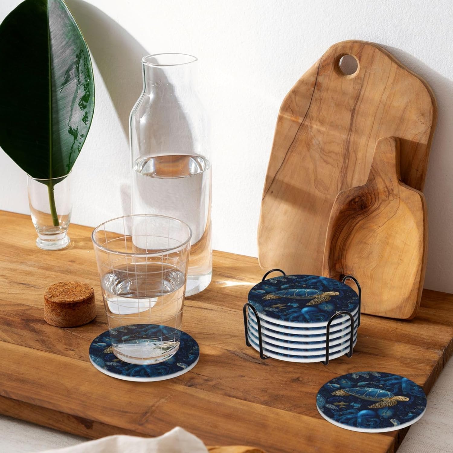Product Name: DCEHGEW Ceramic Drink CoastersMaterial Type: Ceramic with cork bottomSize: Round: 4.1 x 4.1 inches, Square: 3.9 x 3.9 inches, Hexagon: 4.3 x 3.7 inchesPattern: Turtle Octopus About Our Ceramic Absorbent Coasters:Product Features - Crafted from high-quality ceramic, these coasters are odorless and eco-friendly. Their superior absorbency keeps your surfaces dry by quickly soaking up spills from coffee, cola, and other beverages within 10-15 seconds.Applicable Scenarios - Perfect for adding a stylish touch to your kitchen, living room, bar, hotel, or restaurant. These coasters are an ideal present for birthdays, Mother's Day, Father's Day, Valentine's Day, anniversaries, housewarming celebrations, or Christmas.Accessory Structure - Each set includes 6 ceramic coasters with cork bottoms, accompanied by a sleek black metal stand for organized and aesthetic storage. Choose from three different shapes to suit your style and needs.Washing Instructions - Easily clean these coasters with water or a damp cloth.Special NoteDue to different measurement methods, a deviation of up to 0.3 cm in size is considered normal.Please Note:The product images are for reference only. Actual products may vary slightly due to production factors such as batch differences and machine settings. Minor variations in color, position, and size are normal and not considered defects. Thank you for your understanding!Customer Service:We want to make sure you have an amazing experience with us. Please contact us with any feedback you may have. We love to hear from you and usually respond within 12-24 hours.