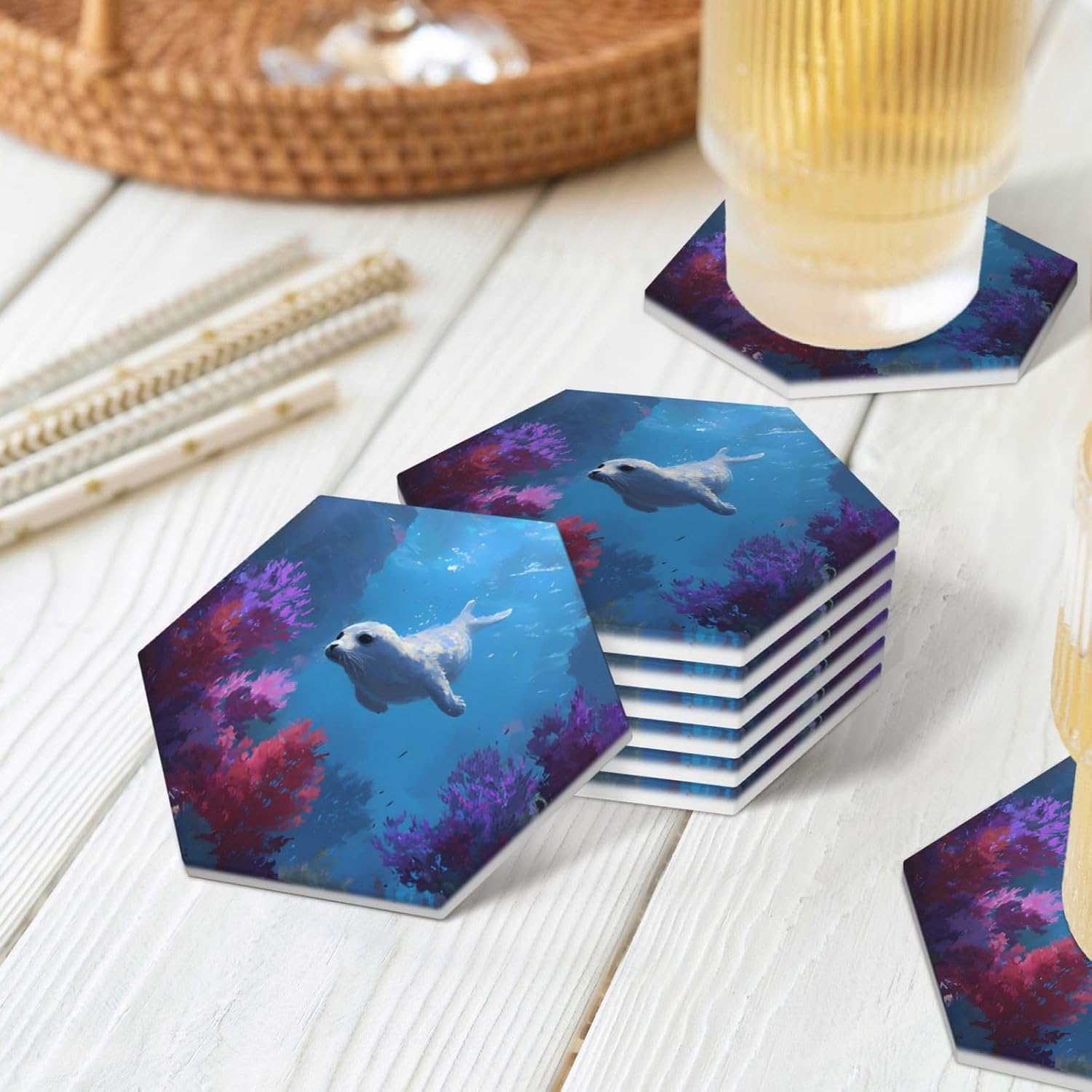 Product Name: DCEHGEW Ceramic Drink CoastersMaterial Type: Ceramic with cork bottomSize: Round: 4.1 x 4.1 inches, Square: 3.9 x 3.9 inches, Hexagon: 4.3 x 3.7 inchesPattern: seal swimming About Our Ceramic Absorbent Coasters:Product Features - Crafted from high-quality ceramic, these coasters are odorless and eco-friendly. Their superior absorbency keeps your surfaces dry by quickly soaking up spills from coffee, cola, and other beverages within 10-15 seconds.Applicable Scenarios - Perfect for adding a stylish touch to your kitchen, living room, bar, hotel, or restaurant. These coasters are an ideal present for birthdays, Mother's Day, Father's Day, Valentine's Day, anniversaries, housewarming celebrations, or Christmas.Accessory Structure - Each set includes 6 ceramic coasters with cork bottoms, accompanied by a sleek black metal stand for organized and aesthetic storage. Choose from three different shapes to suit your style and needs.Washing Instructions - Easily clean these coasters with water or a damp cloth.Special NoteDue to different measurement methods, a deviation of up to 0.3 cm in size is considered normal.Please Note:The product images are for reference only. Actual products may vary slightly due to production factors such as batch differences and machine settings. Minor variations in color, position, and size are normal and not considered defects. Thank you for your understanding!Customer Service:We want to make sure you have an amazing experience with us. Please contact us with any feedback you may have. We love to hear from you and usually respond within 12-24 hours.