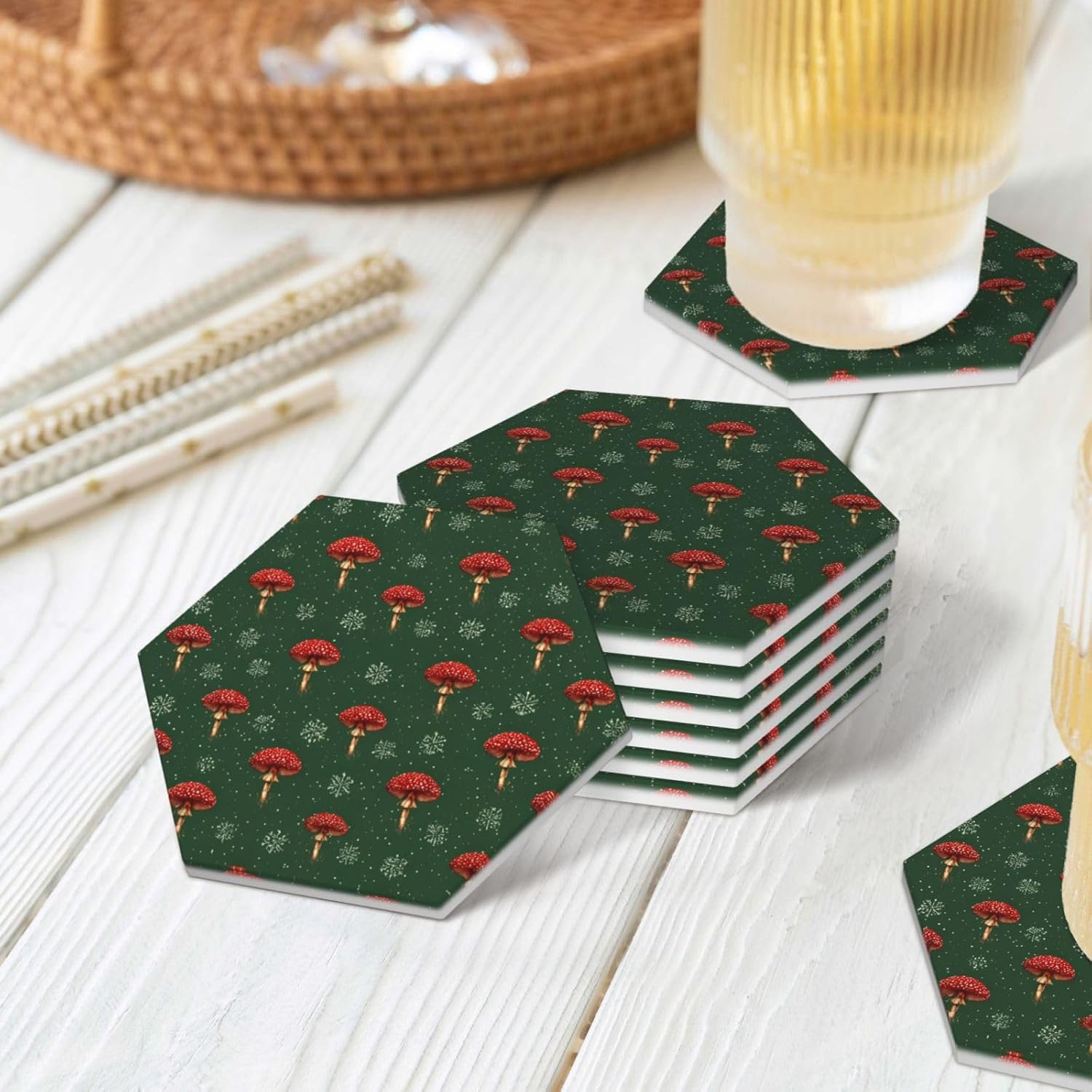Product Name: DCEHGEW Ceramic Drink CoastersMaterial Type: Ceramic with cork bottomSize: Round: 4.1 x 4.1 inches, Square: 3.9 x 3.9 inches, Hexagon: 4.3 x 3.7 inchesPattern: red mushroom grows About Our Ceramic Absorbent Coasters:Product Features - Crafted from high-quality ceramic, these coasters are odorless and eco-friendly. Their superior absorbency keeps your surfaces dry by quickly soaking up spills from coffee, cola, and other beverages within 10-15 seconds.Applicable Scenarios - Perfect for adding a stylish touch to your kitchen, living room, bar, hotel, or restaurant. These coasters are an ideal present for birthdays, Mother's Day, Father's Day, Valentine's Day, anniversaries, housewarming celebrations, or Christmas.Accessory Structure - Each set includes 6 ceramic coasters with cork bottoms, accompanied by a sleek black metal stand for organized and aesthetic storage. Choose from three different shapes to suit your style and needs.Washing Instructions - Easily clean these coasters with water or a damp cloth.Special NoteDue to different measurement methods, a deviation of up to 0.3 cm in size is considered normal.Please Note:The product images are for reference only. Actual products may vary slightly due to production factors such as batch differences and machine settings. Minor variations in color, position, and size are normal and not considered defects. Thank you for your understanding!Customer Service:We want to make sure you have an amazing experience with us. Please contact us with any feedback you may have. We love to hear from you and usually respond within 12-24 hours.