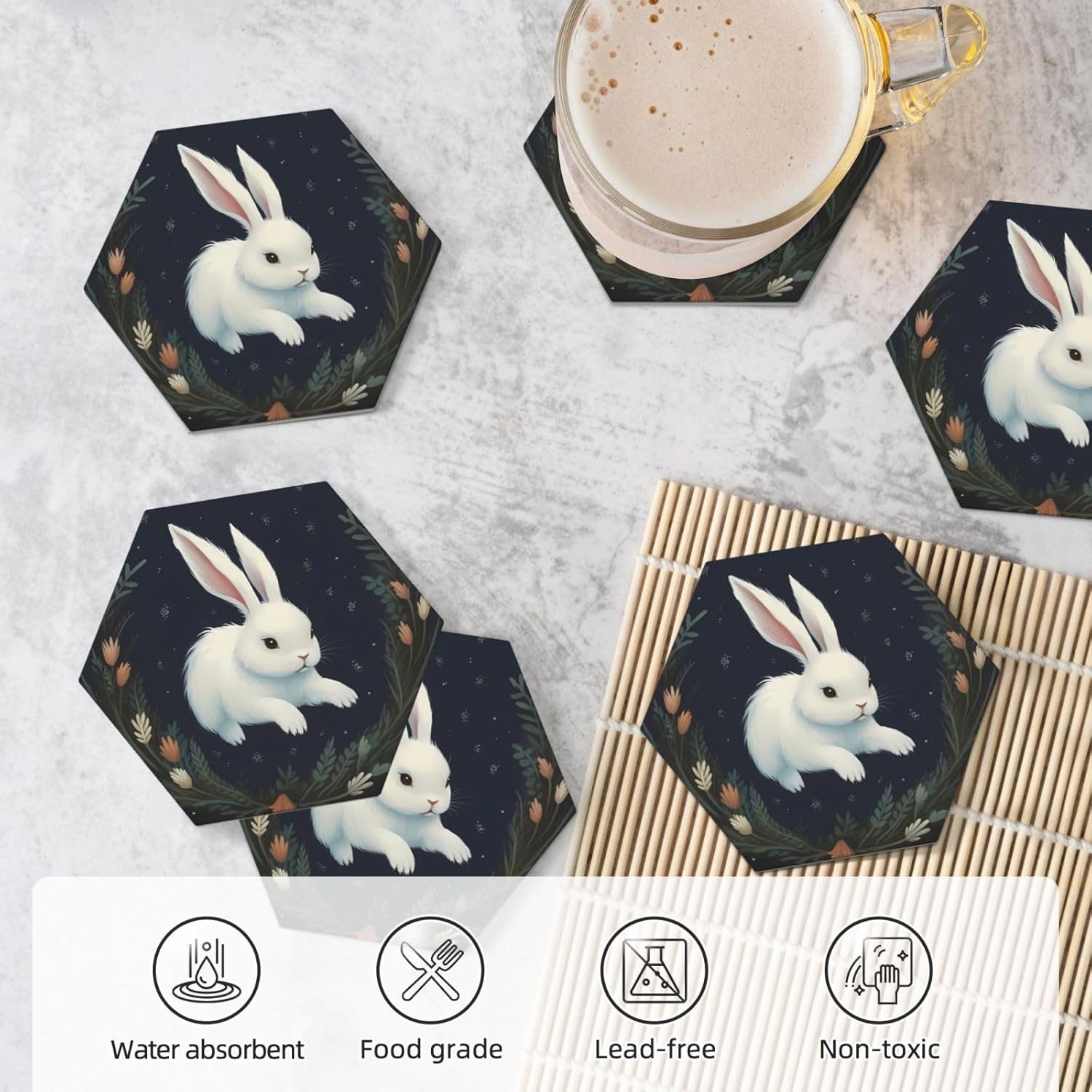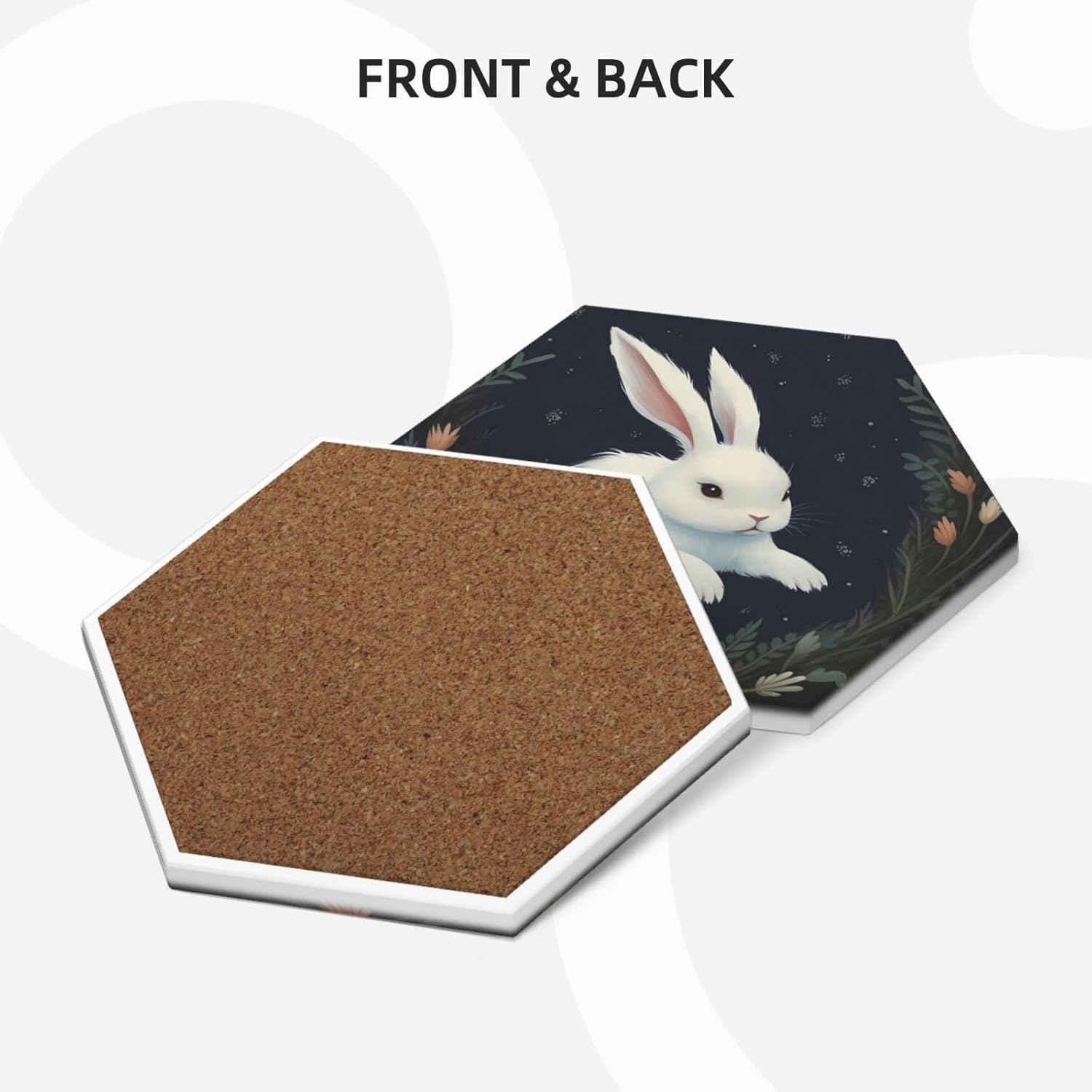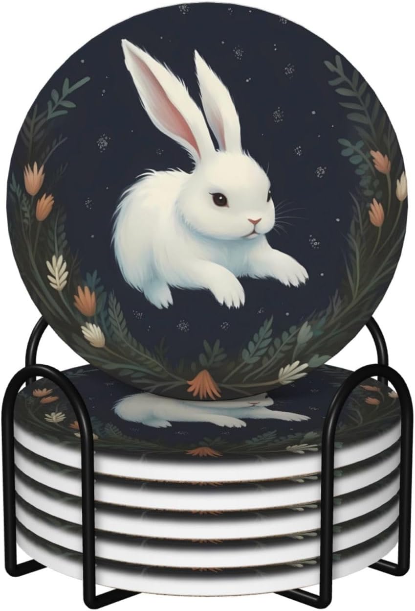 Product Name: DCEHGEW Ceramic Drink CoastersMaterial Type: Ceramic with cork bottomSize: Round: 4.1 x 4.1 inches, Square: 3.9 x 3.9 inches, Hexagon: 4.3 x 3.7 inchesPattern: Cute White Rabbit About Our Ceramic Absorbent Coasters:Product Features - Crafted from high-quality ceramic, these coasters are odorless and eco-friendly. Their superior absorbency keeps your surfaces dry by quickly soaking up spills from coffee, cola, and other beverages within 10-15 seconds.Applicable Scenarios - Perfect for adding a stylish touch to your kitchen, living room, bar, hotel, or restaurant. These coasters are an ideal present for birthdays, Mother's Day, Father's Day, Valentine's Day, anniversaries, housewarming celebrations, or Christmas.Accessory Structure - Each set includes 6 ceramic coasters with cork bottoms, accompanied by a sleek black metal stand for organized and aesthetic storage. Choose from three different shapes to suit your style and needs.Washing Instructions - Easily clean these coasters with water or a damp cloth.Special NoteDue to different measurement methods, a deviation of up to 0.3 cm in size is considered normal.Please Note:The product images are for reference only. Actual products may vary slightly due to production factors such as batch differences and machine settings. Minor variations in color, position, and size are normal and not considered defects. Thank you for your understanding!Customer Service:We want to make sure you have an amazing experience with us. Please contact us with any feedback you may have. We love to hear from you and usually respond within 12-24 hours.