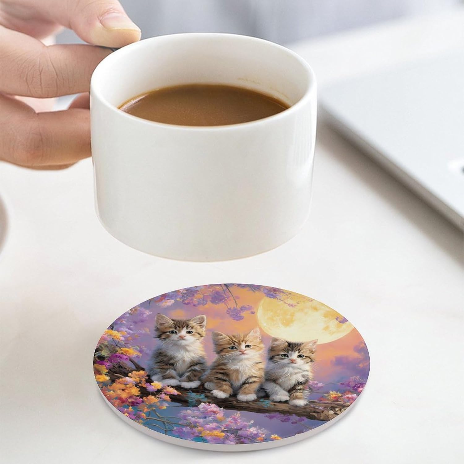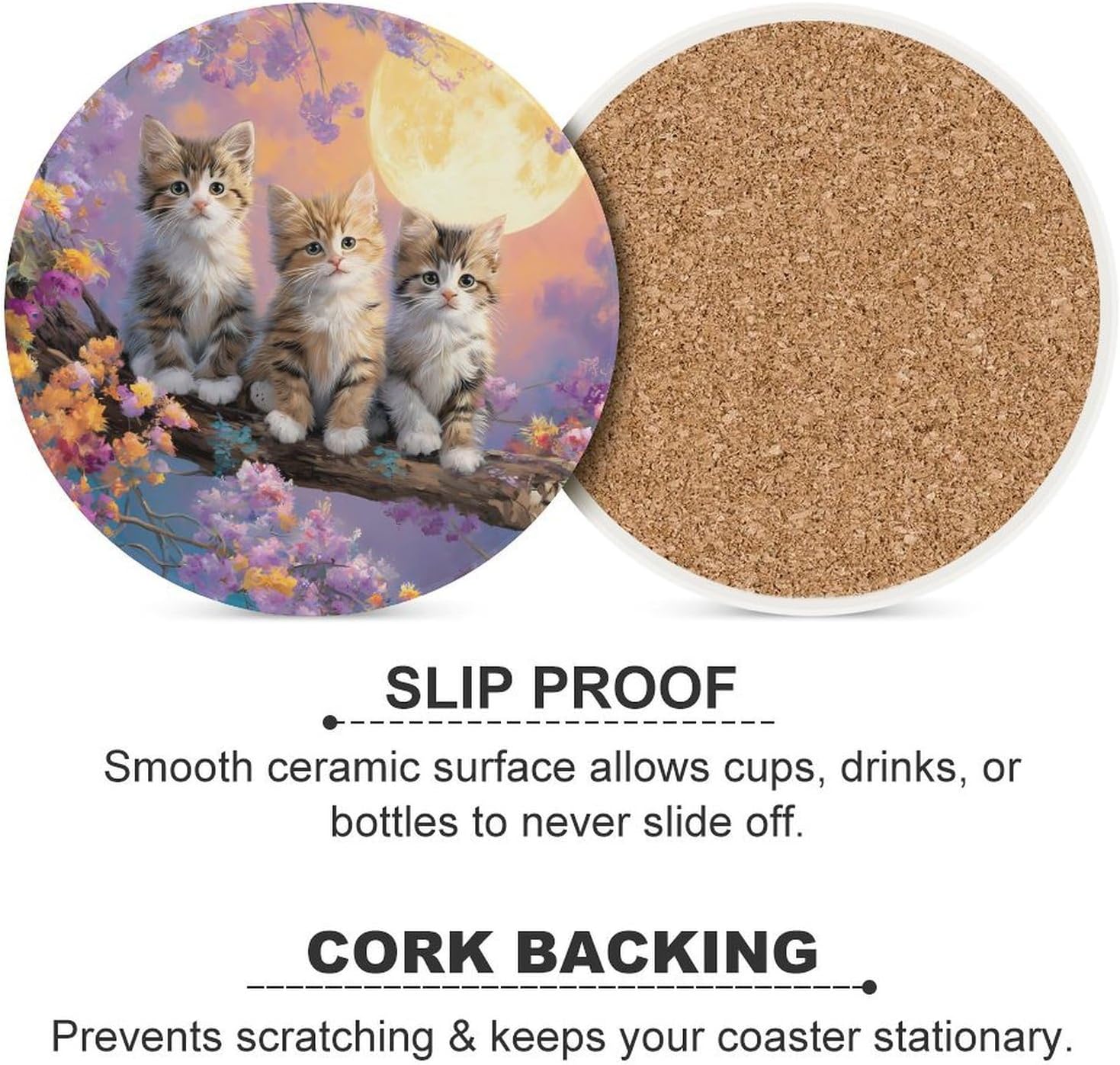 Cute Printed Round Drinks Absorbent Ceramic Coaster with Cork Base Suitable for Kinds of Mugs, Cups, Prevent Tabletop Wear And Scratches, and is Easy to Clean