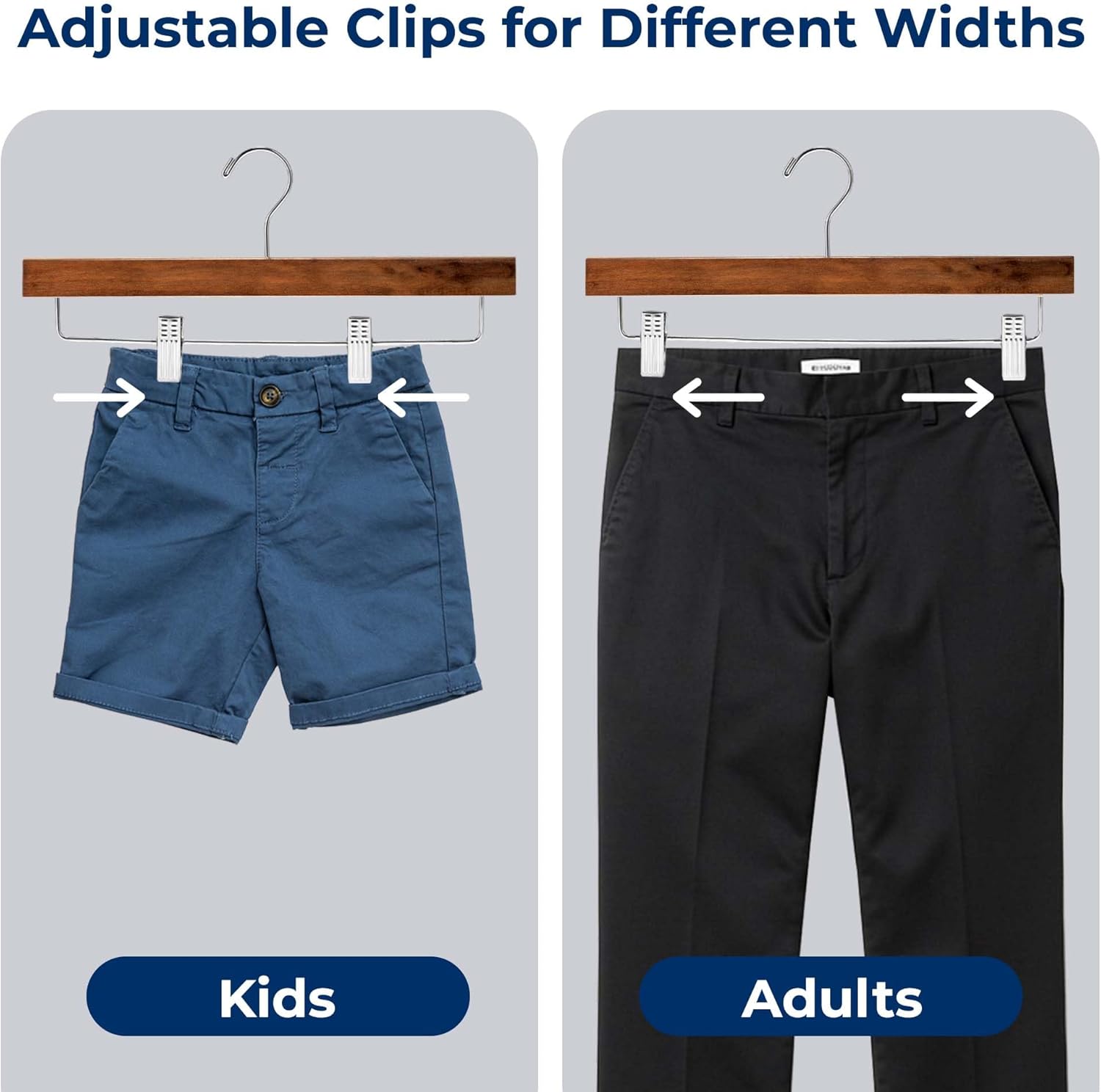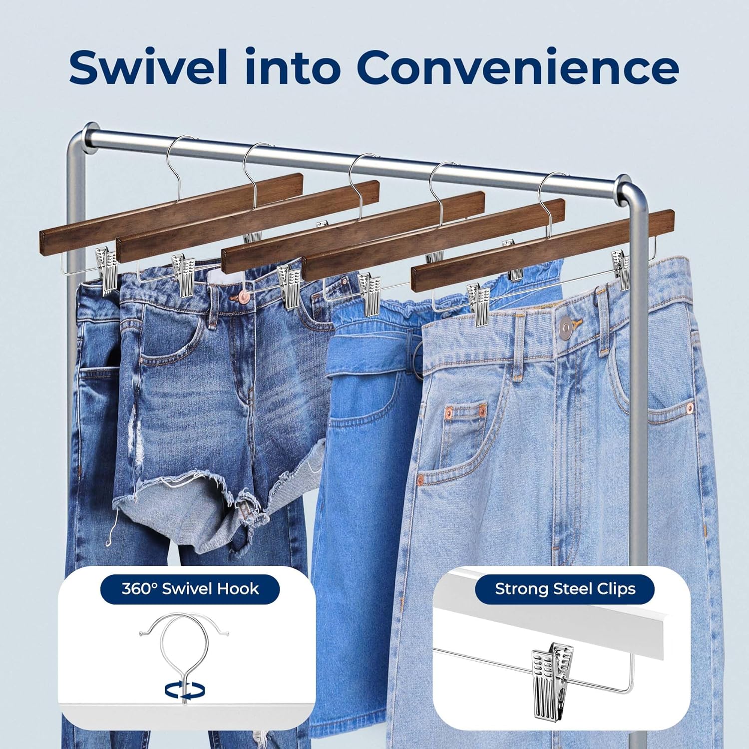 Organize your wardrobe with elegance and functionality using this 30-piece set of premium wooden pants hangers. Crafted from durable wood with a retro finish, these hangers combine style and practicality. Each hanger is designed with strong, non-slip steel clips to securely hold jeans, slacks, skirts, shorts, and more. The 360° chrome swivel hooks provide easy access to your garments, while the adjustable clips accommodate various sizes and styles of clothing. Measuring 13.97" x 0.5" x 6.69", these lightweight yet sturdy hangers are perfect for steady, wrinkle-free hanging. The slim, space-saving design helps maximize closet space, making it ideal for those looking to declutter their wardrobe while maintaining a polished, organized look. With a maximum weight capacity of 10 lbs., these hangers are built to last, supporting everything from delicate fabrics to heavier garments. Whether you're refreshing your closet or looking for a functional upgrade, these versatile wood hangers deliver the durability and sophistication you need. Perfectly balanced between form and function, they are a practical solution for keeping your clothes neat, tidy, and ready to wear.