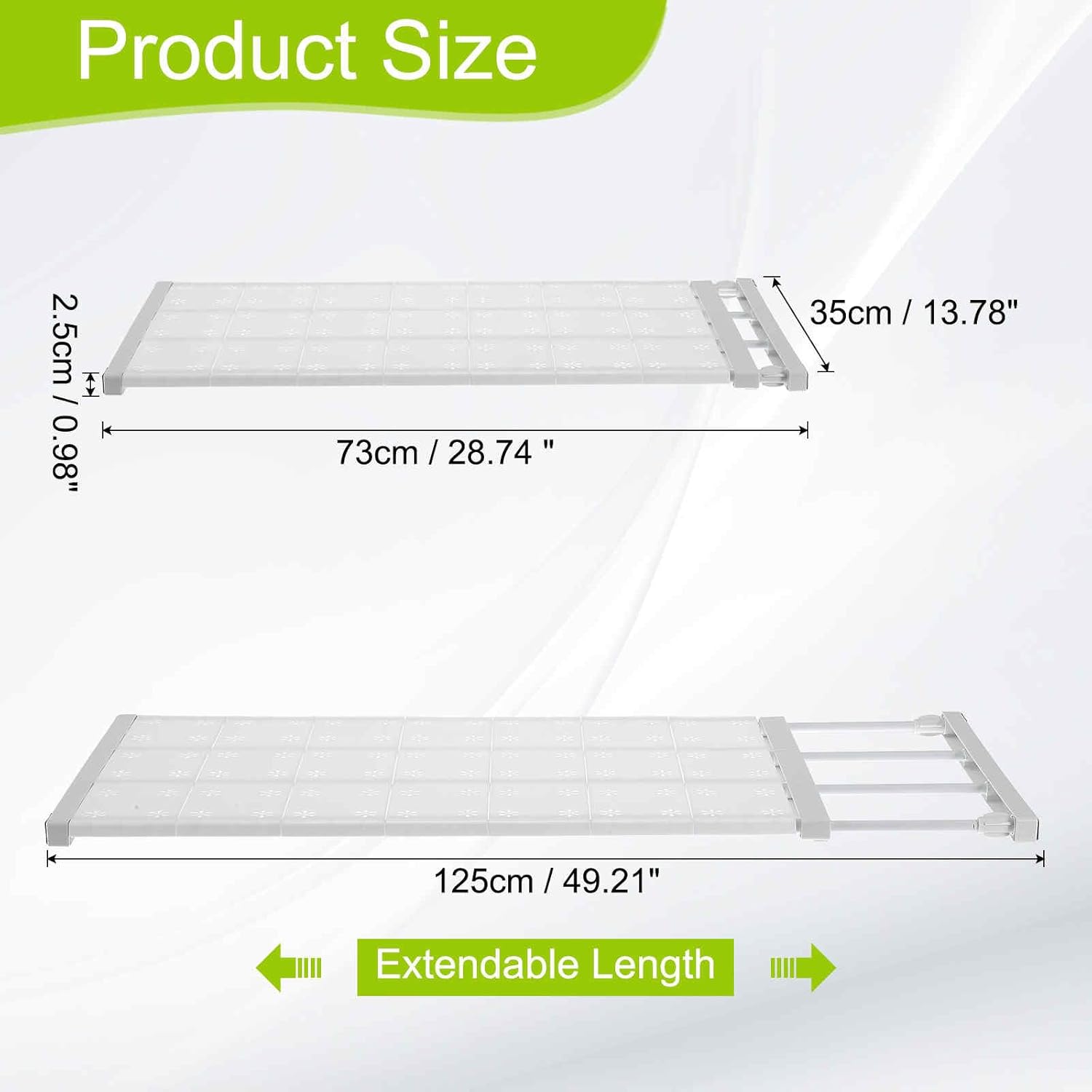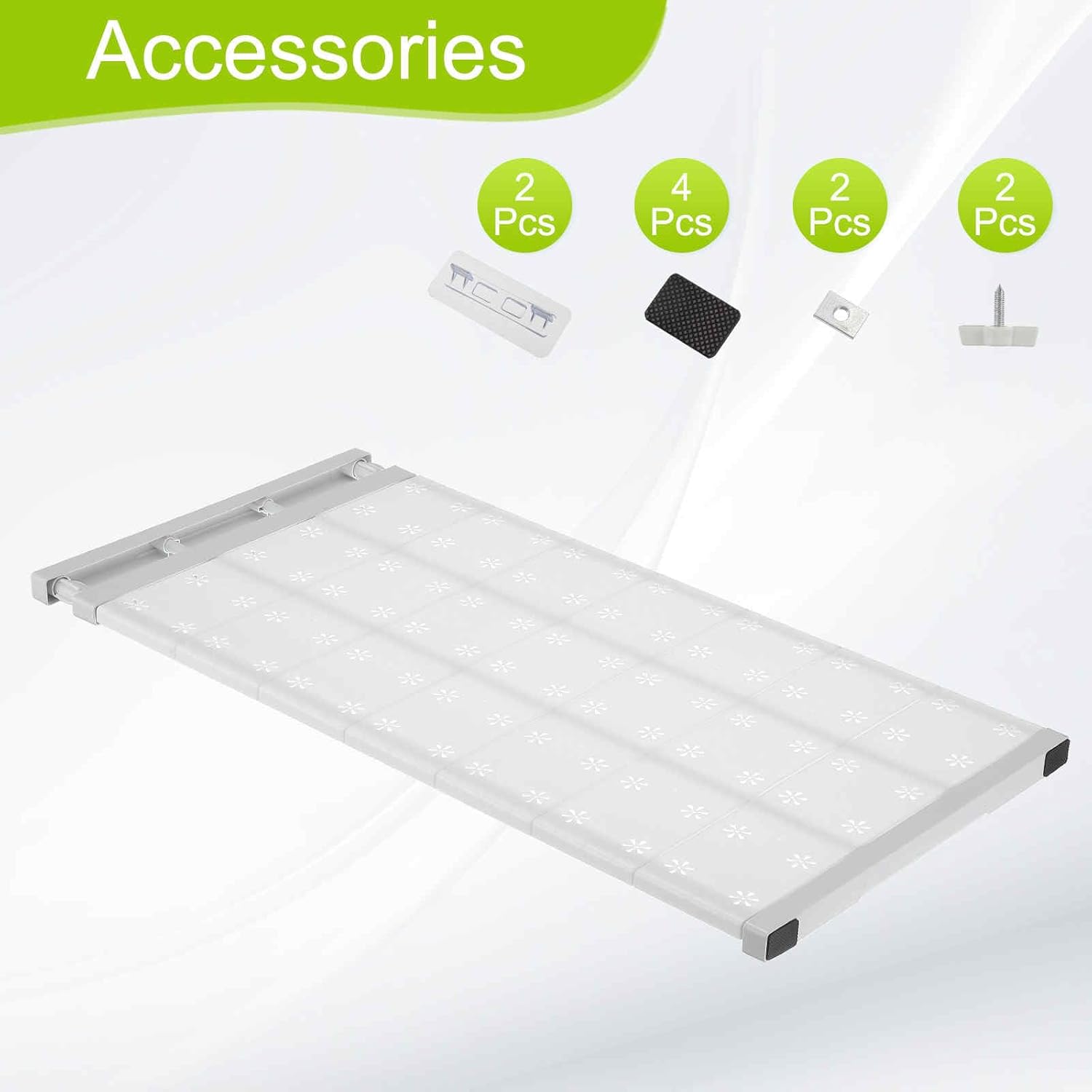 1. Material: Our Closet Tension Shelf is composed of carbon steel +abs+pp material to enhance the load-bearing capacity of the shelf and ensure the it is strong and durable2. Operating instructions: The Closet Tension Shelf requires no tools, screws and holes, and can be easily installed using only friction and tension. According to the need to stretch freely, adapt to different sizes of cabinets.3. Product features: Strong and durable: The closet organizer is equipped with non-slip pads at both ends to ensure stable shelves are not easy to slip. Suitable for a variety of items. The hollow flower design is not only beautiful but can also add color to the home and improve the utilization of space.4. Use scenario: can be used for wardrobe, clothes sorting, keep clean , the kitchen is suitable for placing spices, kitchenware, etc, increasing storage space. Bedroom bathroom: The Closet Tension Shelf is suitable for use under the sink or in the bathroom cabinet for additional storage. Other places can be placed in a variety of environments such as study and office.5. Note: Before purchasing a Closet Organizer, please confirm the required length to ensure that it fits your cabinet.