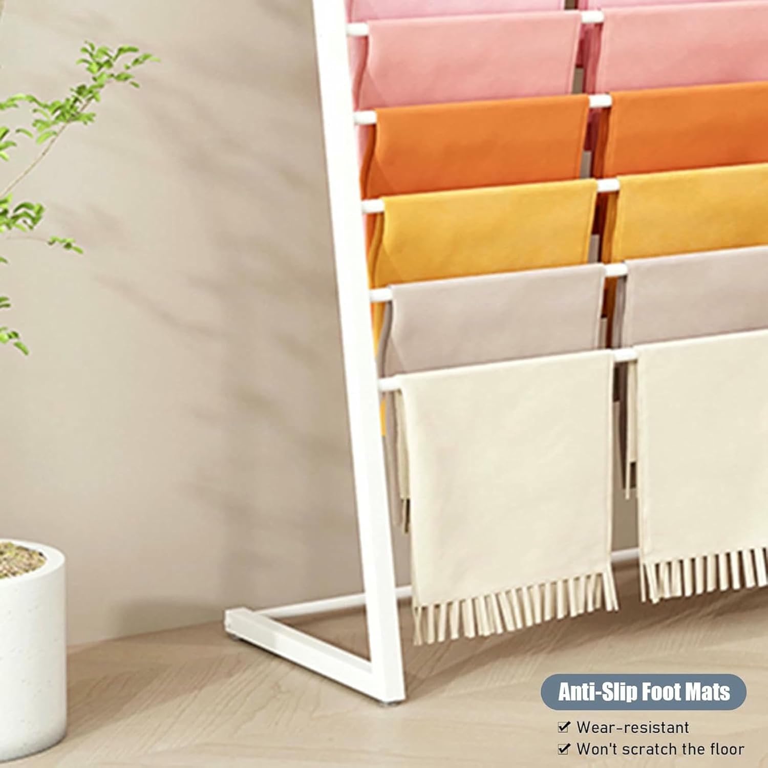 This versatile and elegant metal shelf is perfect not only for displaying scarves, but also for hanging and storing shawls, trousers, gift wrapping paper, wallpaper, newspapers, ribbons and other accessories.Features:Floor Stand.Anti-Slip Foot Mats. Won't scratch the floor.The crossbars are removable for easy storage and access to the ribbon.Easy to assemble.Great for holding your collection in a way where you can see what you have and access it easily.Suitable for florists and craft shops.Specification:Material: Metal, IronSize: Width x Depth x Height60 x 40 x 145 cm/23.6 x 15.7 x 57 inches,80 x 40 x 145 cm/31.5 x 15.7 x 57 inches,100 x 40 x 145 cm/39.3 x 15.7 x 57 inches,120 x 40 x 145 cm/47.2 x 15.7 x 57 inches.Requires Simple AssemblyPackage Contents: 1 × Scarves Storage Rack 【 Scarves or Ribbons Or Wrapping Paper In Pictures Are Not Included 】Notice:If you need more styles, please click our brand to find your favorite styles.Due to different batches and manual measurement, there may be slight error, thank you for your understanding.Satisfactory