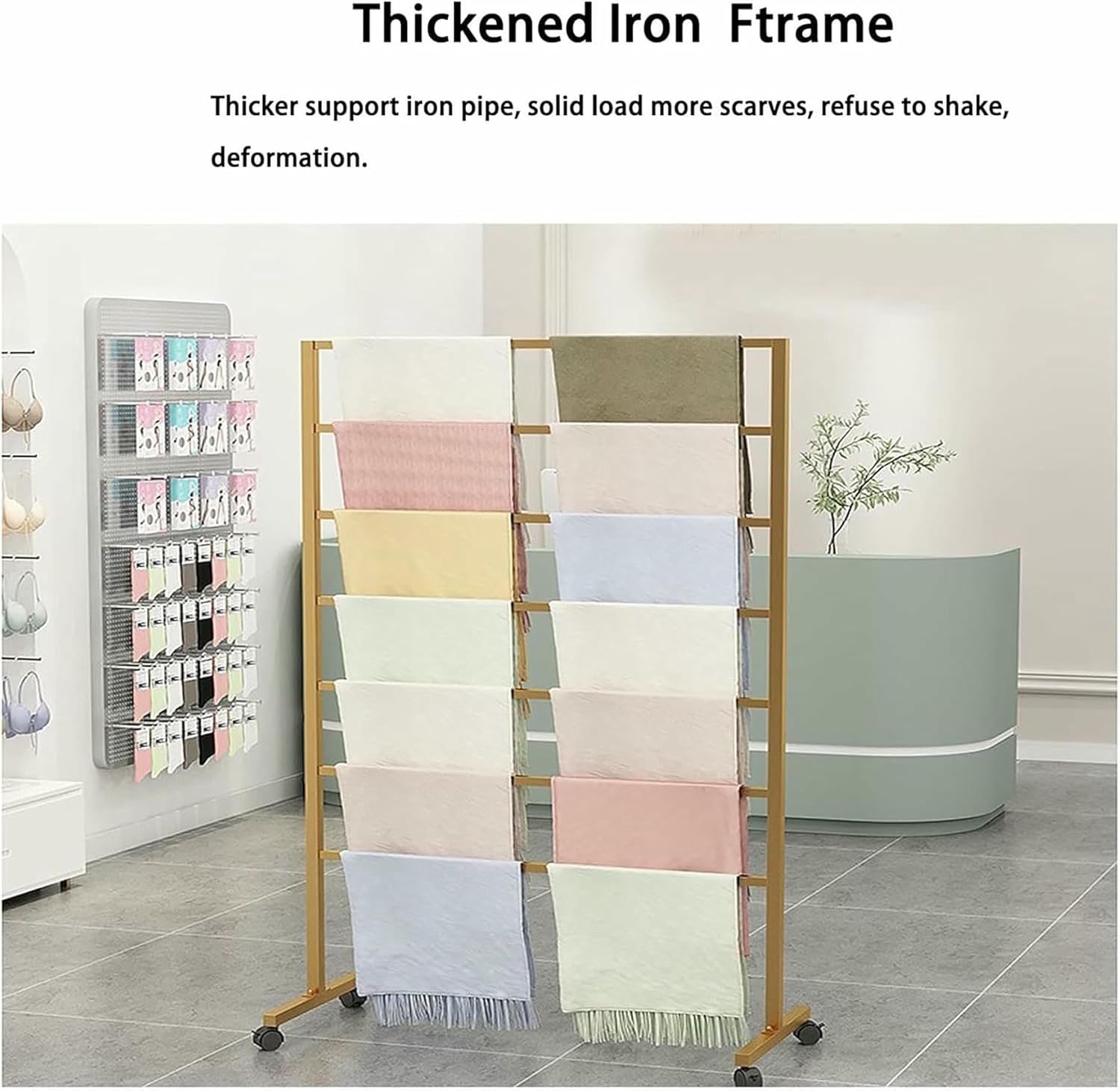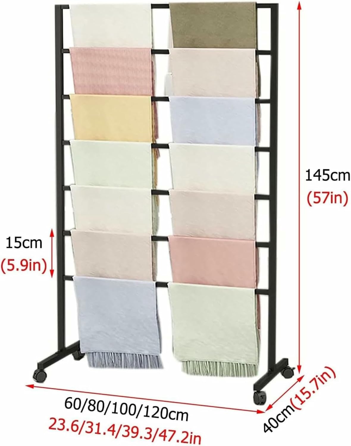 ✿ Description :→ This multifunctional organizer will keep your checkroom organized and beautiful, and can store your scarves, belts, shawls, ribbons, wrapping paper, etc.✿ Feature :→ High-quality iron frame, strong and durable, high load capacity.→ Multi-layer storage, increase exposure, effective and rational use of space.→ Small footprint to avoid clutter. Not only save space, but also can be used as home decoration.→ As a gift to friends and family.→ Suitable for: Clothing Store, Closet, Bedroom, Retail Stores, Flower Shop, Gift Shop, etc.→ Easy to clean : Wipe with wet cloth to remove dirt.✿ Specifications :→ Material : Metal Iron→ Color : Black , White , Gold→ Base Bracket Width: 40cm/15.7in→ Total Height: 145cm/57in→ Crossbar Spacing: 15cm/5.9in→ Crossbar Length: 60cm/23.6in, 80cm/31.4in, 100cm/39.3in, 120cm/47.2in✿ Package Include :→ 1 x Scarf Rack (Not include decorative items such as scarves.)【After-sales Service】If you have any questions about our products or orders, please contact us by email, and we will be happy to assist you and respond to you within 24 hours.