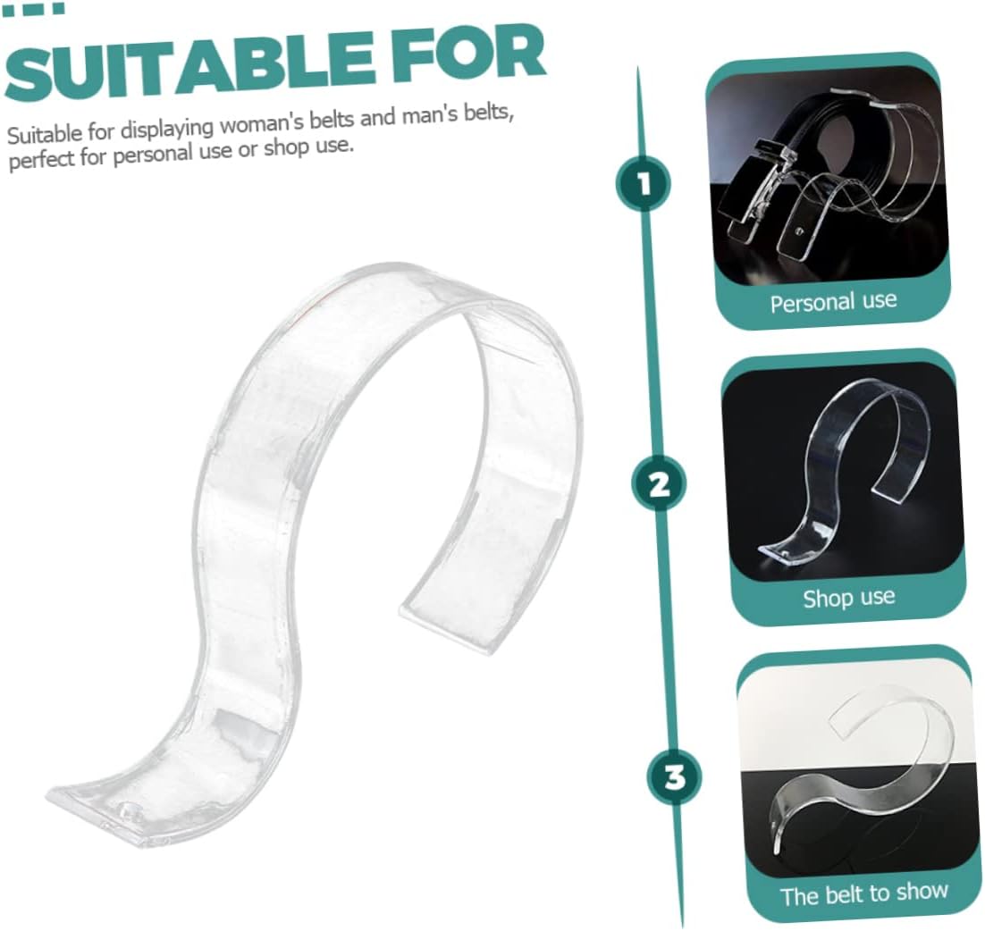 Package List 15 x Belt Display Stands Features -Material: Acrylic belt display stand - Look no further in your hunt for a belt holder organizer, this clear acrylic stand is one of your choice belt display holder. - You can put them at cloakroom, on the table, in a closet or other places you want belt holder. - This clear belt holder is designed to be as beautiful as it is functional, giving you a pleasant using experience belt stand. - Provide enough quantity for you to use, or you can share them with your friends or family belt holder organizer. - A must have for everyone who has a preference of wearing belt, you will enjoy seeing your belt displayed in this stand belt display organizer.Goods Descriptionbelt display stand Crafted from acrylic material which enjoys good durability and fine workmanship ensures its practicality.belt holder stand Creative shape design enables it to stably hold your belts, looking so chic and appealing.belt holder organizer You will always know your favorite belts are secure and displayed