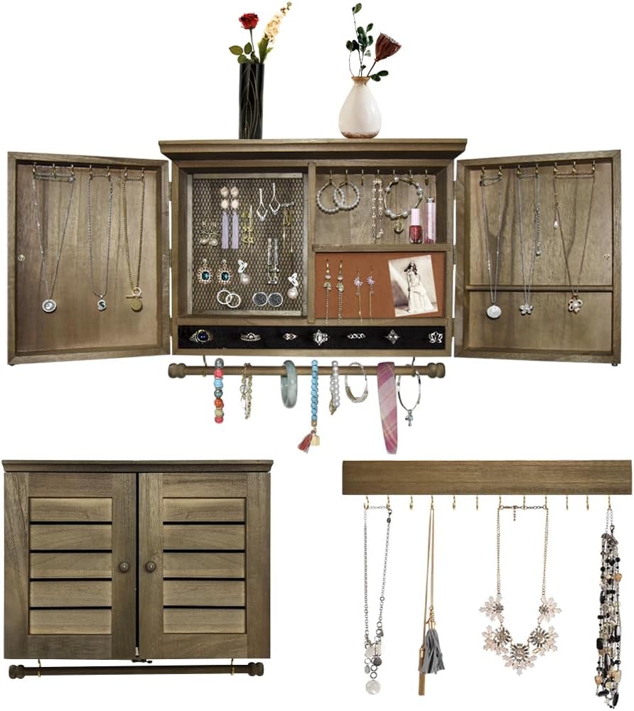MULIFEE Get rid of the mess and get your jewelry well organized! MULIFEE Wall Mounted Jewelry Organizer is what you are looking for. It is a beautiful&rustic decor and will keep all of your jewelry neatly. We redefine and design this Wood Jewelry Organizer, adding a rustic barn door, effectively organizing your jewelry and preventing dust. It arrives ready to store hundreds of jewelry pieces, keeping them tangle-free and ready for easy access! Made of high quality wood with a rustic finish. Removable Bracelet Rod: The removable bracelet rod makes it extremely easy to store bracelets, bangles, watches, bands, and cuffs. Just lift and slide for easy access. Keep all of your accessories in one spot. Hooks for Necklaces:Tangle free necklaces! 33 hooks line the bottom of our organizer, so it's easy to keep all of your necklaces organized and accessible. You will never have to pull the annoying knots out of your chains again! Earring Mesh: The back wire mesh allows you to hang and organize earrings. Gone are the days of mismatched or lost earring pairs. Quickly find the perfect set that matches your outfit. Slots of Rings:The ring slots can effectively and neatly store more than 10 rings The top display shelf can hold additional accessories