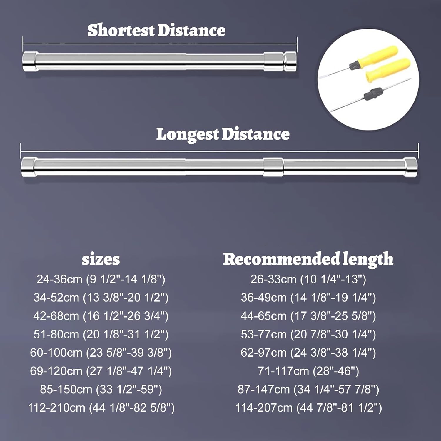 Closet Rod Top Mount Wardrobe Bars:Transform your cluttered space into a well-organized haven with our versatile Closet Rod, designed to maximize your storage potential. Say goodbye to messy rooms and hello to a tidy environment with this essential home accessory. **Product Features:** - **Adjustable Length:** Ranging from 24 to 210 cm (9 1/2" to 82 5/8"), our closet rod is perfect for any size closet or wardrobe. No need for precise measurements thanks to its retractable design. - **Durable Material:** Crafted from high-quality stainless steel, this closet rod is built to withstand humidity and heavy loads, ensuring your clothes stay securely hung without wobbling. - **Enhanced Storage Solutions:** Ideal for small spaces, it creates additional hanging space in your closet, hallway, or entryway, making it perfect for apartments or limited storage areas. - **Easy Installation:** Our closet rod is straightforward to set up, allowing you to create an organized closet in no time. **Usage Scenarios:** Imagine walking into a neatly arranged room where your clothes are easily accessible. Whether you're organizing seasonal outfits, managing daily wear, or simply creating a more pleasant environment, this closet rod is the perfect addition to your home. **Note:** Please allow for slight measurement discrepancies of 1-2 mm due to manual measurements. Color variations may occur due to different monitor settings. **Customer Support:** We are committed to providing excellent service. If you have any questions or concerns about your order or our products, feel free to reach out to us. Elevate your storage solutions today with our reliable and stylish Closet Rod!