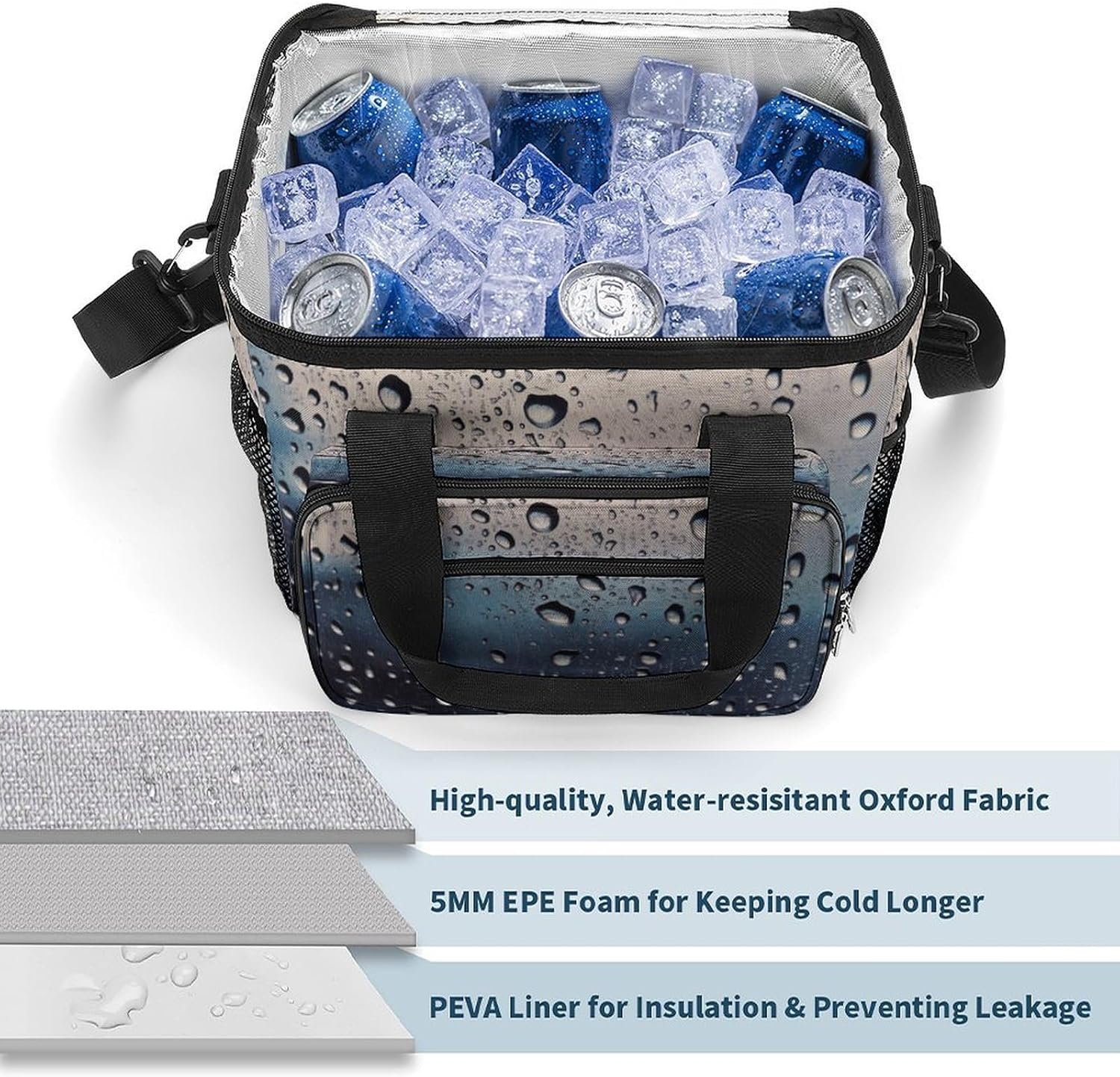 When you're looking for a reliable way to keep your food and drinks fresh while on the move, our Rain Drops on Glass insulated cooler tote is the perfect solution. Made from high-density Oxford cloth with an upgraded aluminum foil lining, it offers superior insulation that maintains the temperature of your items for hours. The leakproof design ensures no messy spills, and the sturdy construction means it can handle the rigors of daily use, whether you're commuting to work or heading out for a weekend camping trip.The 22.5L large capacity provides ample space for all your essentials, from sandwiches and salads to cans of soda and bottles of water. The comfortable 66cm straps make it easy to carry, and the compact vertical design doesn't take up unnecessary space in your car or backpack. Whether you're packing a meal for the office, preparing for a family picnic, or stocking up on groceries, this cooler bag has you covered.Forget about flimsy coolers that fall apart after a few uses or fail to keep your food fresh. Our reusable cooler tote combines practicality, durability and style in one package. Its neutral design works for everyone, and its versatility makes it a must-have accessory for anyone with an active lifestyle. Invest in a cooler bag that meets all your needs and simplifies your on-the-go eating experience. Lightweight Cooler Bags Oxford Cloth Cooler Bags Ice Packs Reinforced Handle Ice Chest Cooler Bag Tote Cooler Bag Versatile Cooler Bags Portable Insulated Cooling Everyday Cooler
