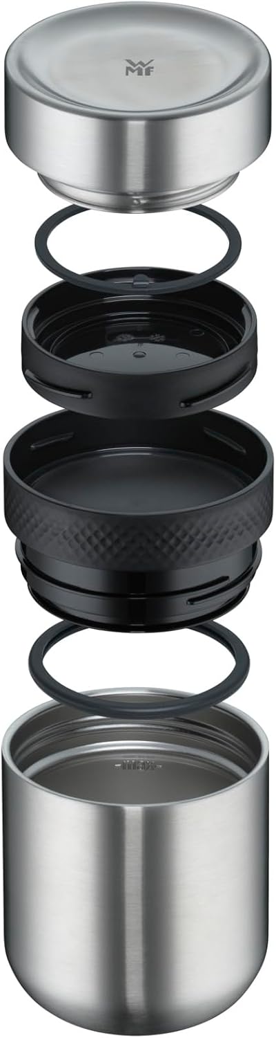 Enjoy homemade food anytime and anywhere - whether in the office, school, university or travelling, no problem with the My2Go Thermo food container from WMF. The high-quality insulated container consists of two separate containers. The lower double-walled main container with 300 ml volume features outstanding ThermaPro insulation that keeps cold drinks cold for up to 12 hours and hot drinks hot for up to 6 hours. The separate 200 ml storage container keeps additional ingredients ready - such as cereal with chilled yogurt or crispy croutons for hot soup. So that nothing can go wrong on the go, the clever and elegant takeaway container is made of durable Cromargan and of course leak-proof. For a relaxed end of the day, it can be cleaned in the dishwasher for comfortable, hygienic cleaning.
