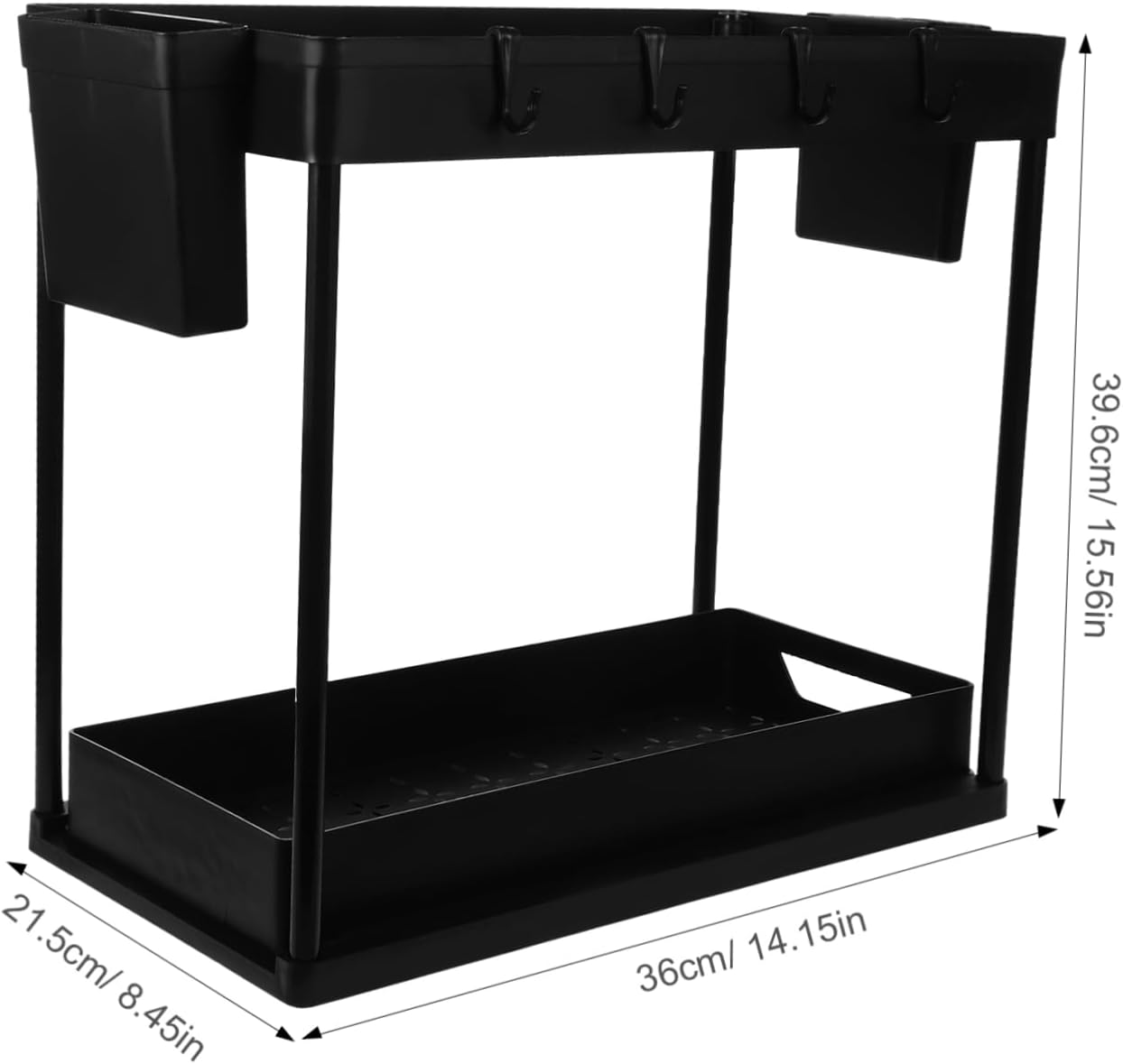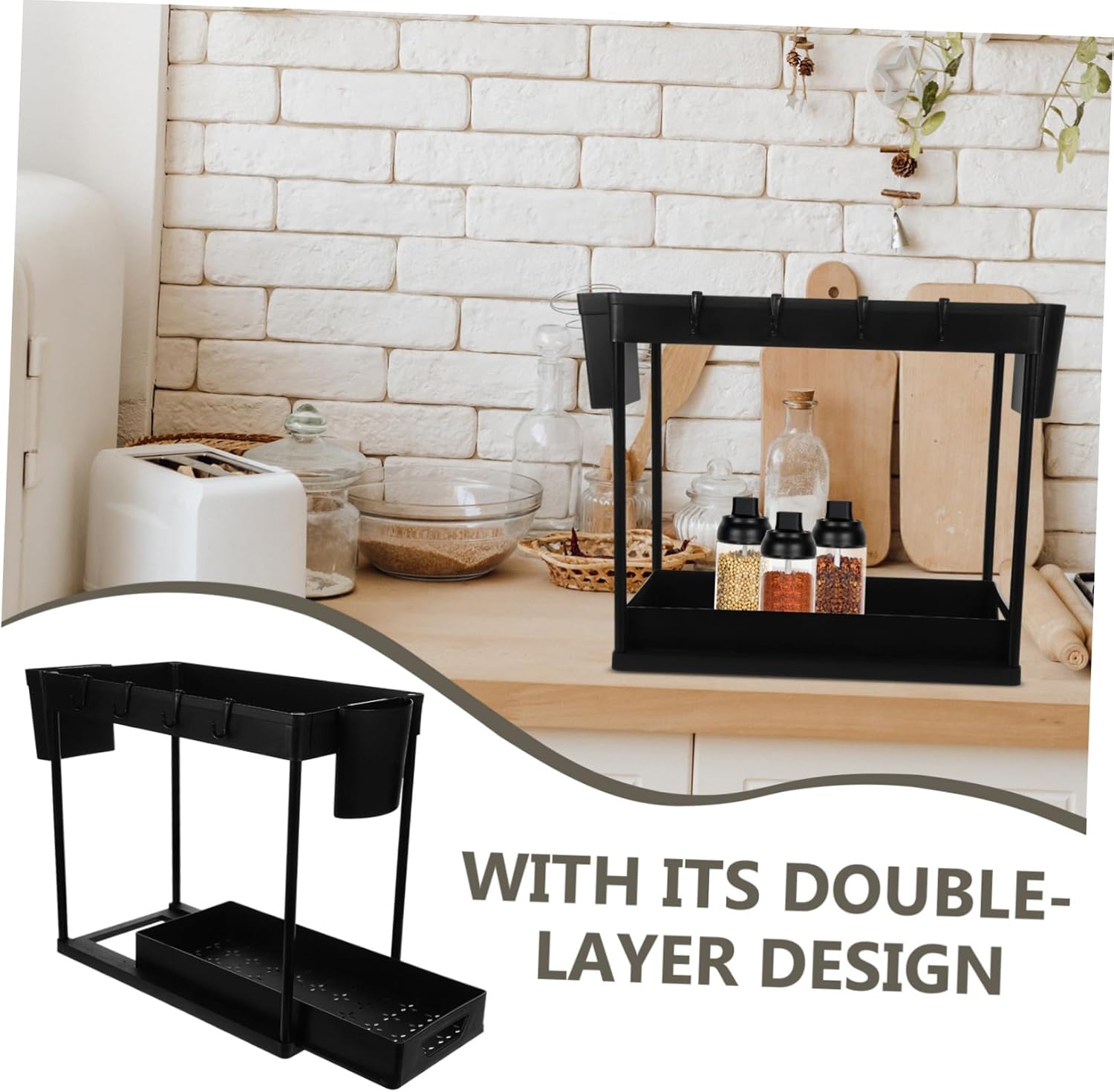 Package List 1 x storage rack Characteristics -Color:Black Under Sink Storage Rack -Size:39.60X36.00X21.50cm/15.56X14.15X8.45in Kitchen Countertop Rack -Material:Plastic Under Sink Spice Holder - With sliding design, it allows you to easily access the item you need in the cabinet, very convenient to use Telescopic Sink Storage Rack. - It has a wide range of application, suitable for kitchen countertop, under sink, cabinet and so on Sink Storage Rack Holder. - With 2 tier design, the storage rack has enough capacity, which can meet your different storage needs Kitchen Organizer. - The storage rack is made of plastic material and with process, not easy to break or crack, to use Kitchen Cabinet Organizer. - The cabinet organizer rack adopts hollowed out design, which can drain the water, sanitary and to use Spice Jar Double-layer Rack.Goods InformationUnder Sink Organizer It is designed to keep your kitchen tidy and organized by providing storage space for spices, condiments, and even chopsticks.Under Sink Drawer Organizer With its double-layer design, it offers ample storage space to meet the needs of different-sized kitchens.Retractable Sink Storage Rack The pull-out design allows for easy access to your items, saving you time and effort.Kitchen Supplies The Kitchen Sink Double-Layer Storage Rack is a versatile and addition to any kitchen