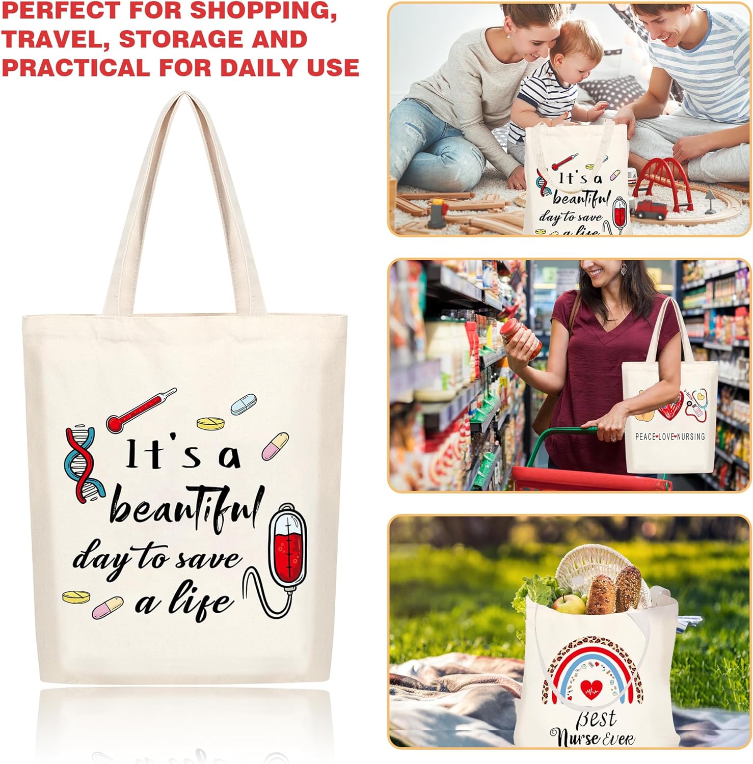 Enough quantity: you will receive 16 pieces nurse gift tote bags in different 16 styles, printed with needle barrel, nurse cap, stethoscope. The well-designed and well-made tote bags will surely win your nurse' hearts,enough to meet your daily usage and replacement needs, and allow you to share with others Meaningful gifts: the nurse tote bag is colorfully printed with inspirational quotes, which will be an ideal gift to show your deep appreciation for others, the reusable grocery bags are meaningful and heartwarming gifts for presenting to your nurse on Nurse's Day, Thanksgiving, Mother's Day, Christmas, retirement, birthday, graduation and other proper occasions About size information: each nurse canvas bag measures approx. 40 x 38 x 9 cm/ 15.8 x 15 x 3.5 inches, large enough to hold your daily supplies, and the handle measures approx. 65 cm/ 25.6 inches in length, which can be handheld, and can also be carried on your shoulder,which can store your phone, wallet, cosmetic, keys, and fit for using in office, dating, travel, portable and practical Quality material: the nurse tote bags are made of quality fabric canvas, without any unpleasant smell, not easy to break and fade, wear and tear resistant, reusable and serviceable, which can be applied for a long time Widely applicable:wonderful gift for nurse, graduation gift for nurses, gift for nurses week, nurse practitioner gift, registered nurse gift, nurse birthday gift, nurse appreciation, this reusable shoulder bag is big and strong enough to hold your purse, shoes, lunch, binders, notebooks, tablet or small laptop, not only can be as a grocery shopping tote bag, but also can be a tote bag for school, beach bag, gym tote bag, yoga bag, etc.