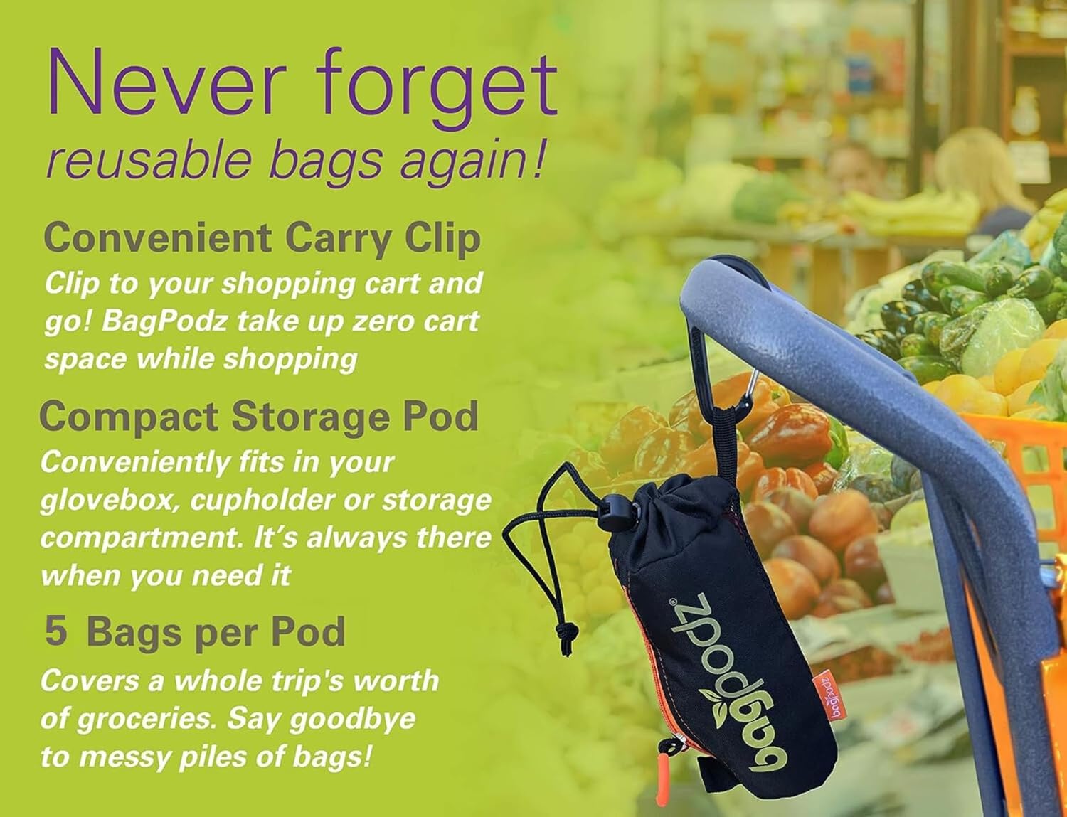 All the reusable grocery bags needed for an entire shopping trip in one compact and convenient ‘pod’. The grocery bags easily come out of the pod one-at-a-time, as needed at checkout. Reloading is just as easy. No more bulky bags cluttering your vehicle. BagPodz is a portable pod of reusable bags for groceries that conveniently clips to your cart. It's the ultimate Earth-conscious solution that ends the need for plastic shopping bags. BagPodz is small enough to fit in your glove compartment or in your cup holder. It's on hand anytime you go shopping. Each grocery bag is made from a 100% RipStop Nylon. Bluesign Certified material that's low impact and sustainably produced with stringent safety standards. These heavy duty reusable shopping bags are light, yet strong. Each reusable grocery bag holds up to 50lbs of groceries! Our RipStop Nylon bags are far more durable than polyester alternatives.