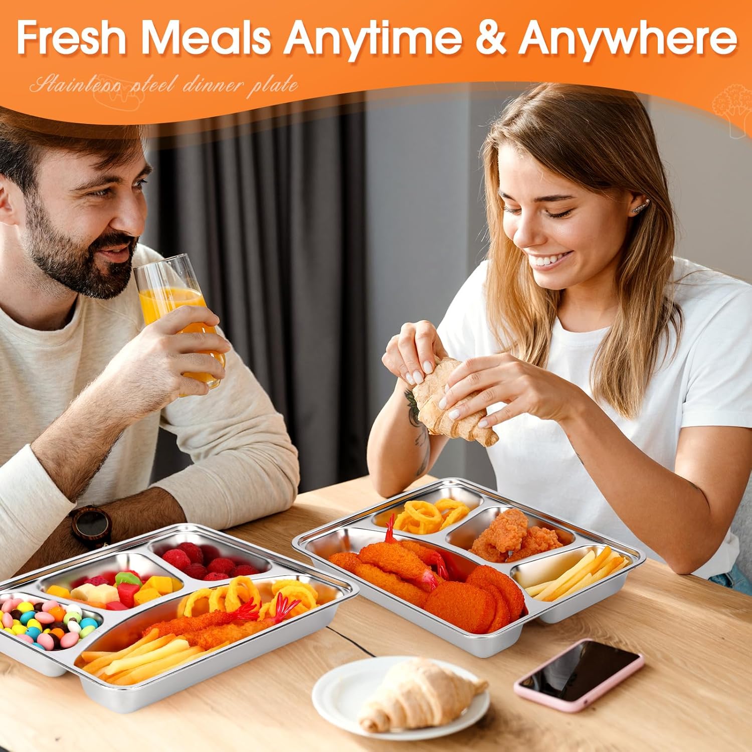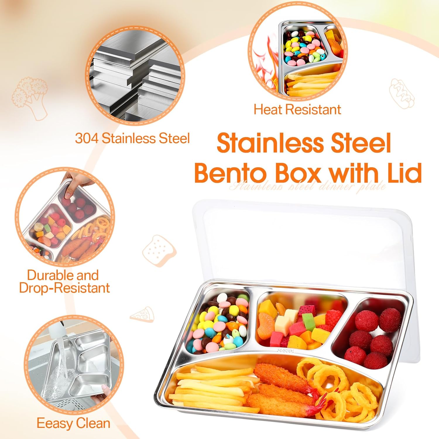Features: You will receive 6 stackable, lightweight, and durable meal prep containers with transparent lids, featuring a 4-compartment design for balanced meals, ideal for various occasions and made from food-grade 304 stainless steel for safety and easy cleaning. Specifications: Material: 304 stainless steel Color: as show Size: about 11 x 8.7 x 1.6 inches/ 28 x 22 x 4 cm Package includes: 6 X stainless steel snack containers Notes: Manual measurement, please allow slight errors on size. The color may exist a slight difference due to different screen displays.