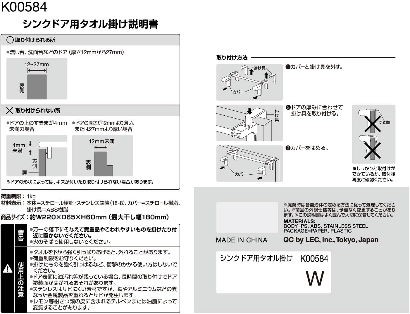 Can be attached to a sink door. Compact shape that does not take up much space. Can also be attached to line handles. Load Capacity: 2.2 lbs (1 kg). Rust resistant stainless steel pipe.