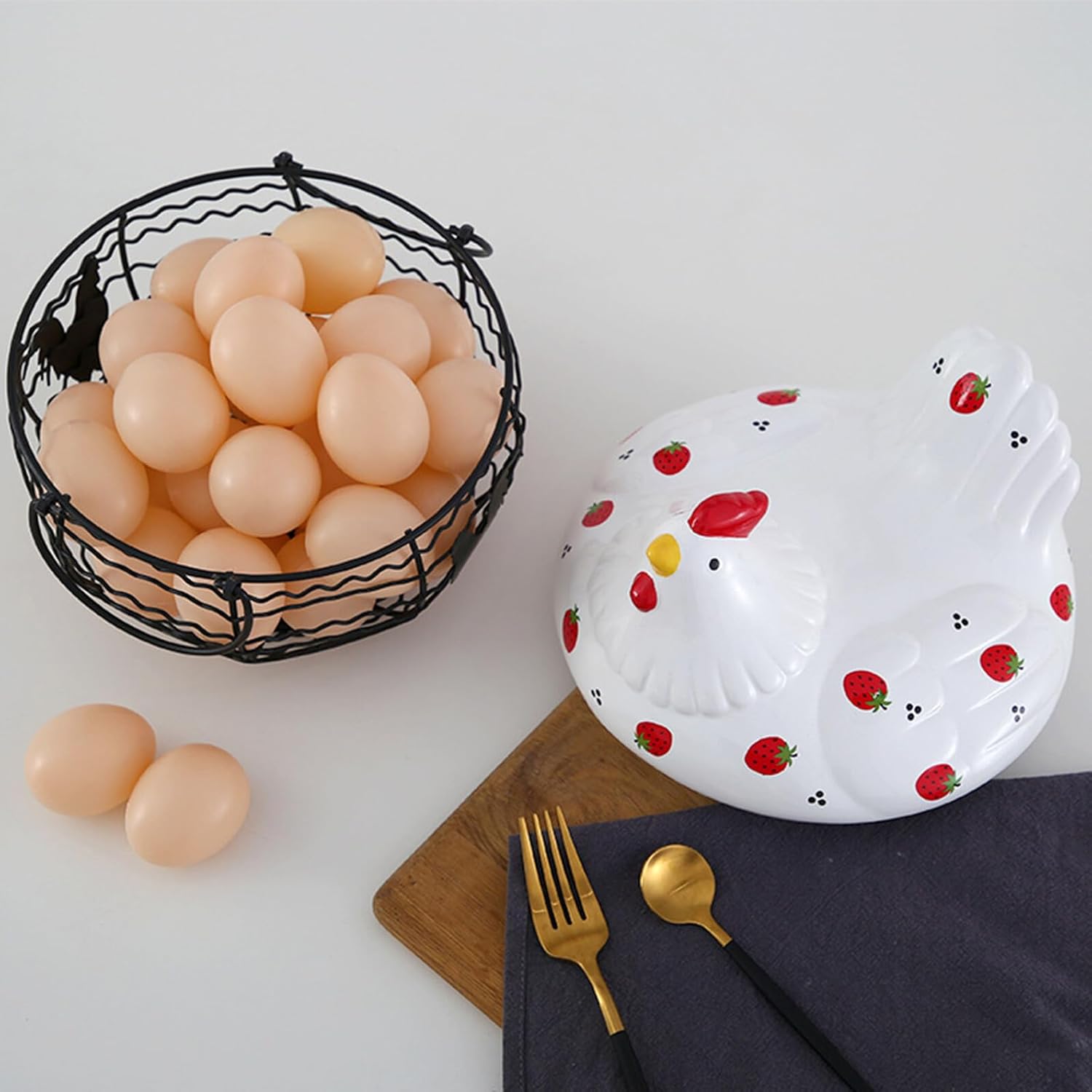 Package List 1 x Storage Basket Characteristics -Product Info:Wrought iron storage basket -Material: Ceramic, iron -Size: About 22.00X21.00X23.00cm/8.65X8.25X9.04inch -Country style design, make your home have a natural and rural atmosphere, decorative and practical Storage Container. -Practical and convenient, the mesh basket allows you to take the eggs you want out Household Storage Basket. -Used to store eggs, fruits and other foods, it is an essential helper in the kitchen Fruit Storage Basket. -This iron mesh basket with a hen lid is a work of art and a good decoration for the kitchen Storage Basket. -A hen perches on a wire basket, which is an interesting and practical way to store eggs. Egg BasketGoods DescriptionFruit Organizer Creative shape, can be used as decor at home, hotel and shop.Sundries Container This is an iron art storage basket, which could be used for a long time.Iron Art Container Great storage container for fruit, egg, sundries or any other small items.Storage Container Simple and , this item adopts workmanship