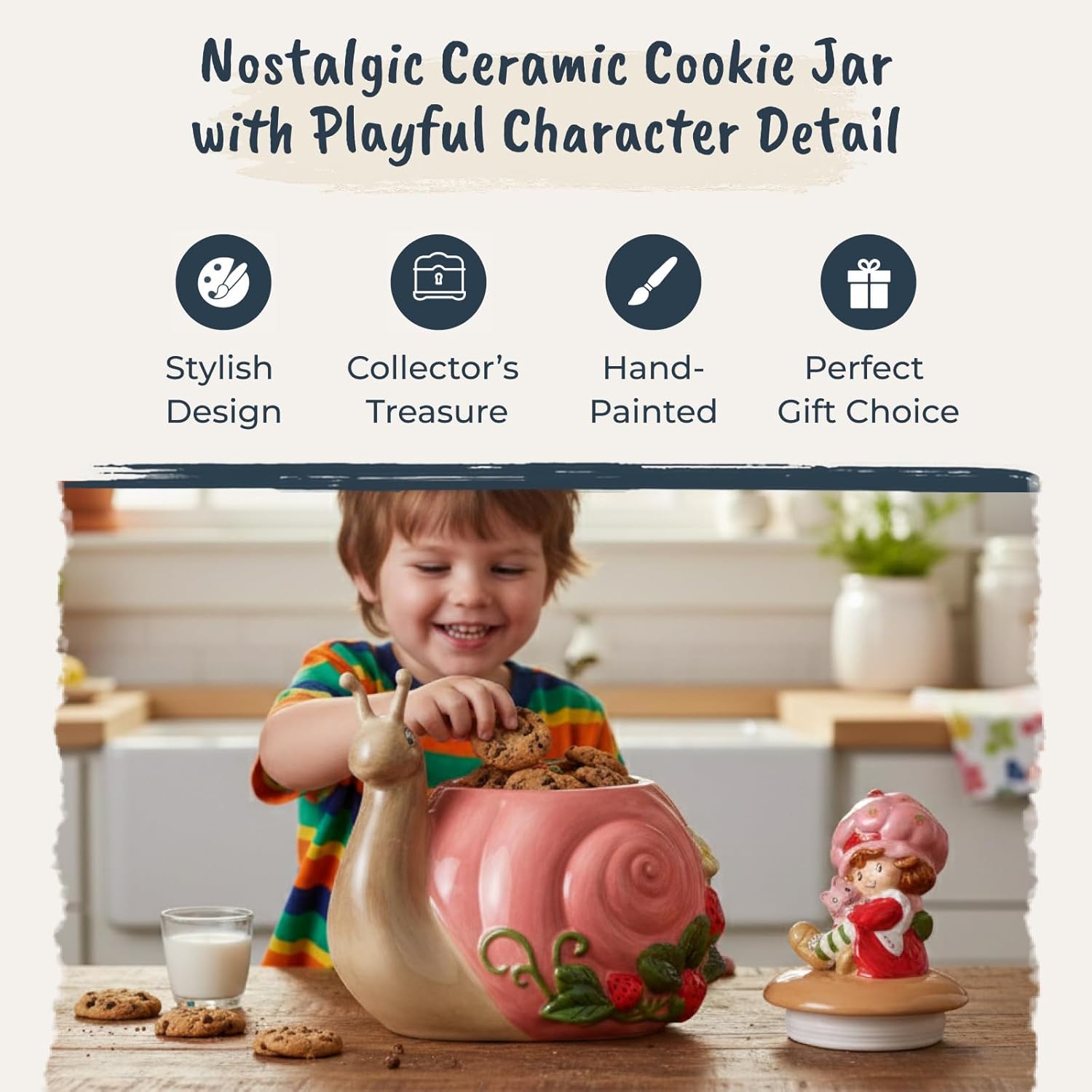 Bring playful charm to your kitchen with Strawberry Shortcake’s Berry Snail Sip n’ Steep Cookie Jar by Blue Sky Clayworks. This ceramic jar features a whimsical berry snail design and bright detailing that delights collectors and fans alike. Practical for storing cookies or treats, it also serves as a cheerful display piece.