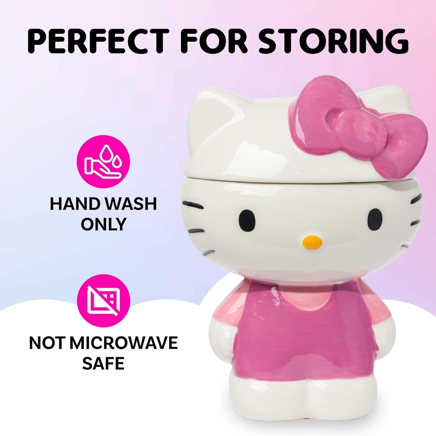 Kawaii fans will love this adorable Hello Kitty cookie jar for their kitchen. Sculpted to look just like Miss Hello Kitty, it holds 64 oz and features an airtight lid to keep baked goods, chips, snacks and more fresh. It makes a great gift for Sanrio Collectors and Hello Kitty fans of all ages. Have confidence knowing you are purchasing officially licensed Sanrio Hello Kitty products from Silver Buffalo. NOT microwave or dishwasher safe. HAND WASH ONLY. Silver Buffalo provides fans with their favorite official character merch. Working in collaboration with licensors and brands, Silver Buffalo develops unique, creative, and ground-breaking products with a devotion to detail and innovation. Silver Buffalo prides itself on manufacturing and distributing playful products that connect fans with their favorite cartoon characters, superheroes, movies, tv-series and more. Celebrate your fandom!