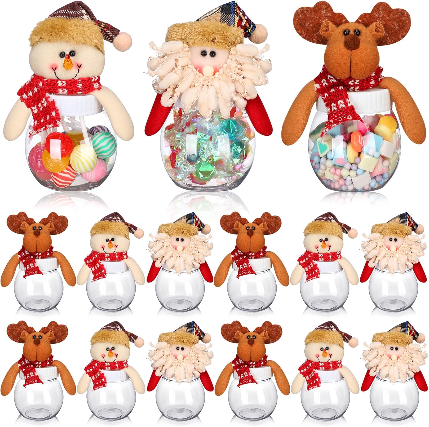 Features: With a size of around 5.91 x 3.15 inches, our Christmas jar with lid is light weighted with a generous opening. This makes it easy to fill and carry around, while the lid ensures your candies remain fresh and are securely stored. Our Christmas candy tins with lids surpass their utility by doubling up as delightful Christmas decorations. Besides containing treats like candies, cookies, or chocolates, these jars, with their festive theme, can shine brightly on your tabletops as captivating decorations, enhancing your seasonal decoration with joy and color. Specifications: Material: PVC Color: clear Size: about 5.91 x 3.15 inches/ 15 x 8 cm Package includes: 12 x Christmas candy jars Notes: Manual measurement, please allow slight errors on size. The color may exist a slight difference due to different screen displays. Please understand that candies in the picture are not included.