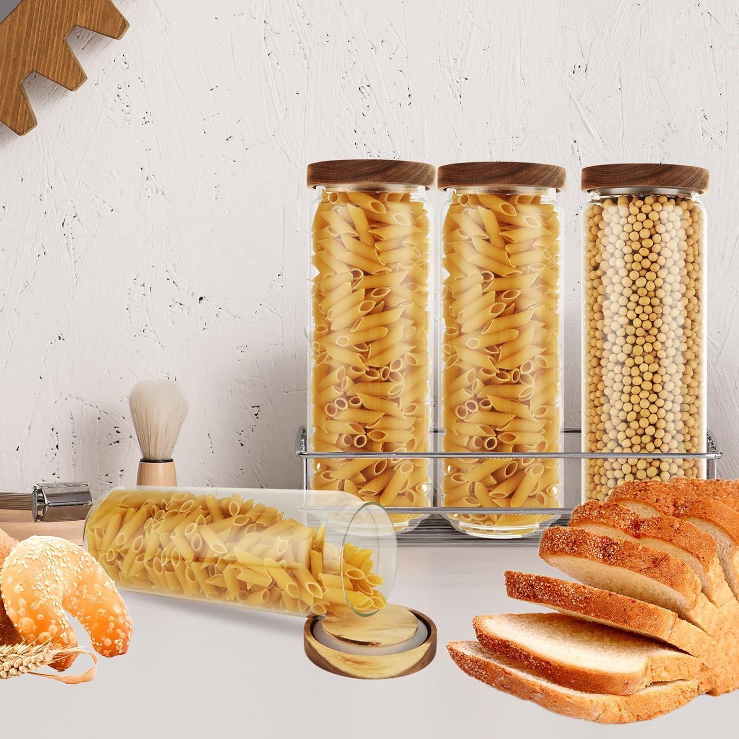 CertBuy 4 Pack 42OZ Glass Food Storage Jars with Lids, Glass Jars with Wooden Lids, Food Containers with Airtight for Pasta, Cookies, Nuts, Coffee, Cereal, Flour, Screw On Kitchen Jars
