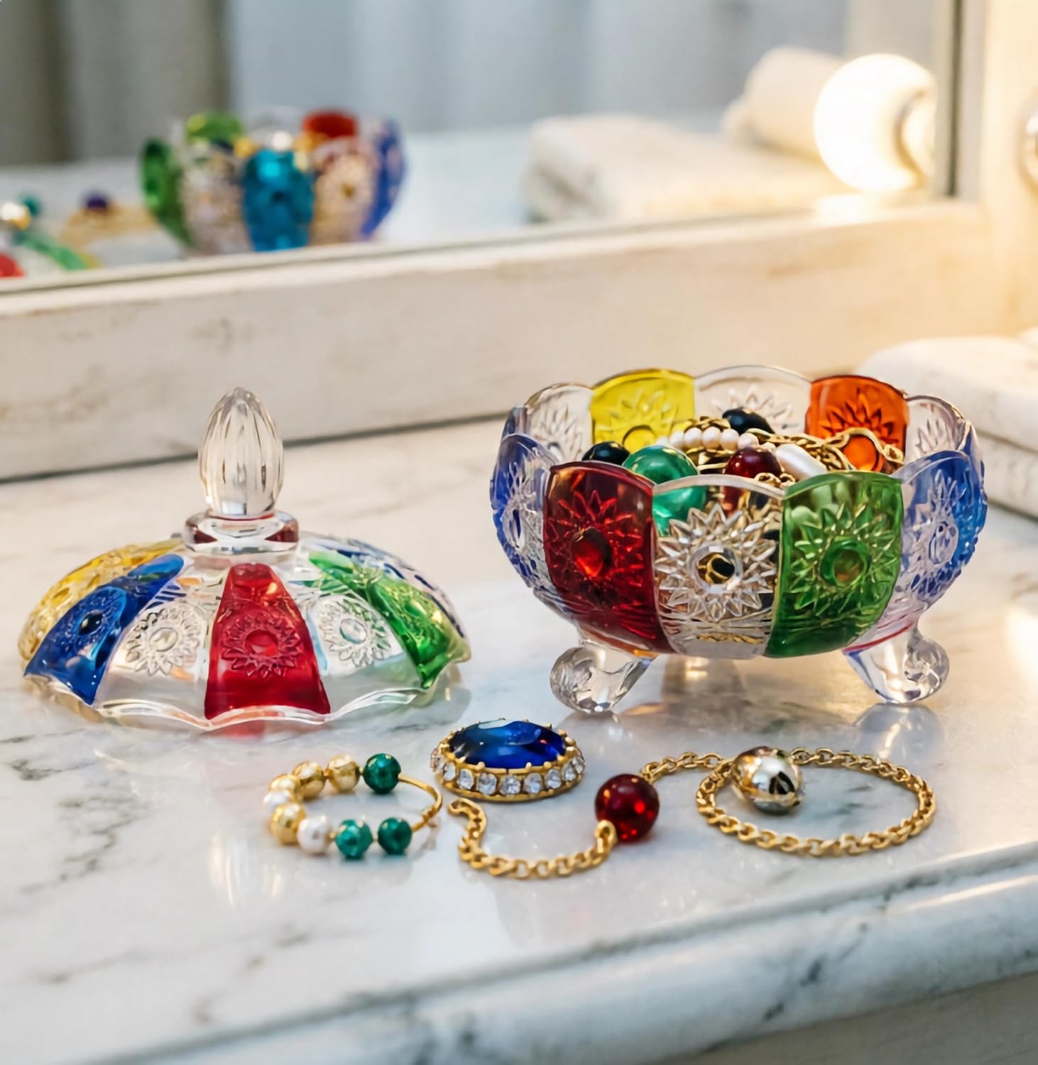 IDEAL FOR YOUR NEEDS This vintage designed vibrant colors glass jar allows you to use it for small wrapped/unwrapped candies, chocolate, cookies, nuts, fruits, trinkets and even jewels, adding a splash of adorable charm to any tabletop décor. it's a necessity for every househol. KEEP ORGANIZED Crystal candy dish glass jar with lid can store a variety of small items, keep food and materials dry and clean from moisture, keep items neat and organized. High-end image is very suitable for wedding, candy buffet, kitchen decoration, family bathroom. BEST GIFT Glass candy jars make great gifts for any occasion. The perfect gift for Christmas, Birthday, Wedding Anniversary, Valentine's day, Father's day, Mother's day, Housewarming, College Graduation, St. Patrick's day, Job Promotion, and secret Santa gifts! SPECIFICATIONS Product name: Hand-painted Carved Glass Jars with Lid Material:Glass+Crystal Process:Hand painted Dimension:14cm/5.51in x 13cm/5.12in Capacity:450ml /15oz Weight: 0.75kg/1.65pounds NOTES: They are not dishwasher safe, microwave and oven safe.