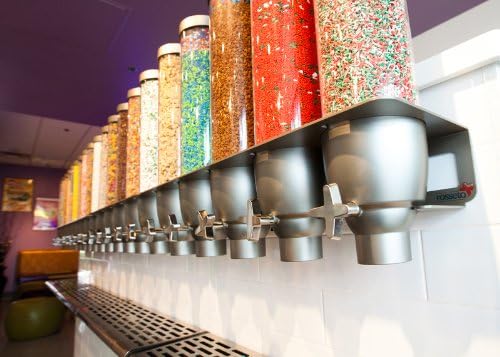 EZ-SERV® wall-mount Topping dispensers balance a steel frame with tall acrylic cylinders to create impressive product visibility, distinctive design elements and contrasting vertical presentations. Whether you are dispensing candy, toppings, cereal, spices, nuts, or any other dry food, the EZ-SERV® will provide the proper portion control. First in, first out replenishment (FIFO) will keep your dry goods fresher longer for the next service and is easy to clean.