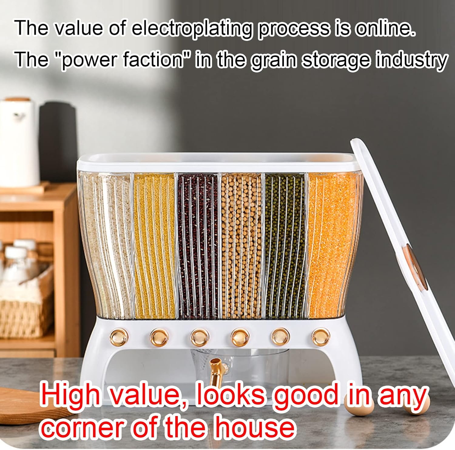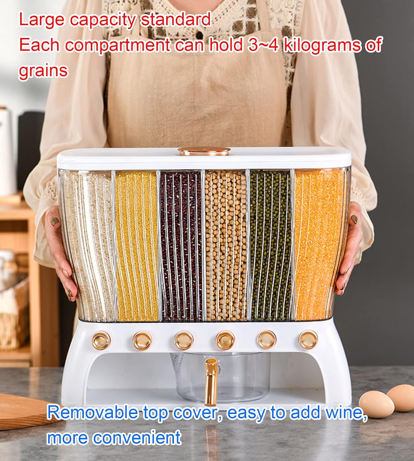 6 Grid Kitchen Cereal Dispenser, Wall Mounted, Cereal Dispenser, White Make your kitchen clean and tidy with the wall mounted dry food dispenser. With its transparent body, you can immediately get what you need. Simply press to get them out without a mess. Easy sticker installation with super strong holding power. If you use it on the wall, you save a lot of space! Wall mounted dry feeder Material: plastic Capacity: 10 L Material: PP Colour: white Size: approx. 42 x 36 x 16.5 cm / 16.5 x 14.1 x 6.49 inches. Weight: approx. 2.5kg. Package includes: 1 x Wall Mounted Dry Feeder The 6-grid kitchen food dispenser can be used to load millet, red beans, mung beans, soybeans, etc., and take rice with one click, which is convenient and fast. The large-capacity and simple design not only helps you organize your messy kitchen, but also allows bulk grains to be stored longer. Healthy and convenient.