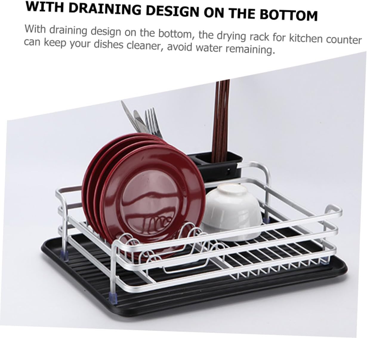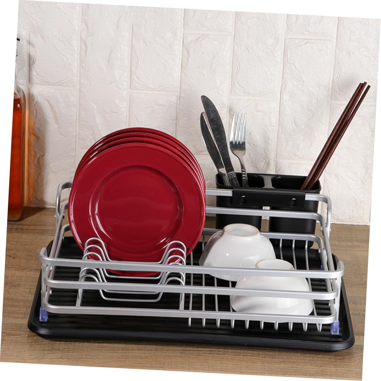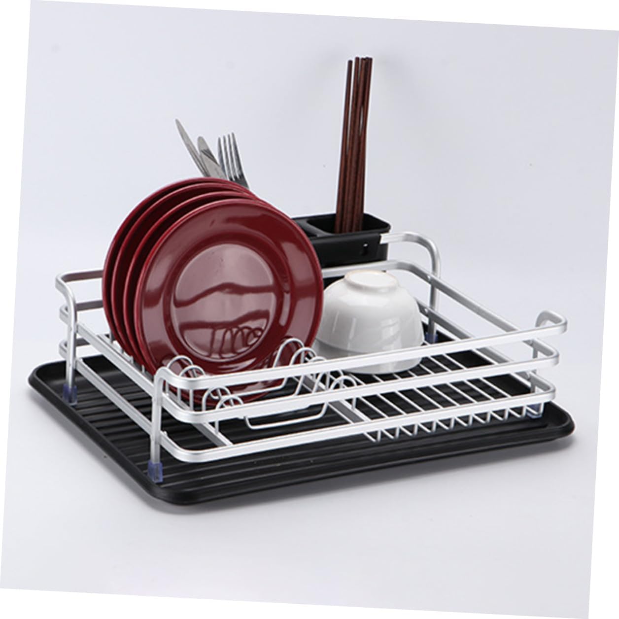 Package Include 1 x Dish Rack Features -Material:Aluminum,Plastic -Color:Black -Size:42.00X30.00X14.00cm/16.51X11.79X5.50in -Product Info:Dish rack - This dish rack has a water draining dish to catch drips and keep your countertop dry vertical dish drying rack. - Large capacity, can assort dishes, forks, cutters, plates and wine glass etc, fit your different needs kitchen drainage rack. - Designed with feature of draining, the dish drainers for kitchen counter keep it clean kitchen dish drying rack. - With the cutlery holder design, store and classify your cutlery in a better way, the dish rack is of multiple uses dish racks. - Adopting , this kitchen drying rack for dishes is and sturdy, withstand .Goods Informationutensils drying rack With detachable draining plate design on the bottom can let it dry quickly and avoid tableware from water remaining.drying rack kitchen Featured by compartment slots and cutlery holder design, for storing different utensils securely.dish racks Are you still upset by the kitchen utensil clutter? This kitchen dish drying rack can help you to with the problem