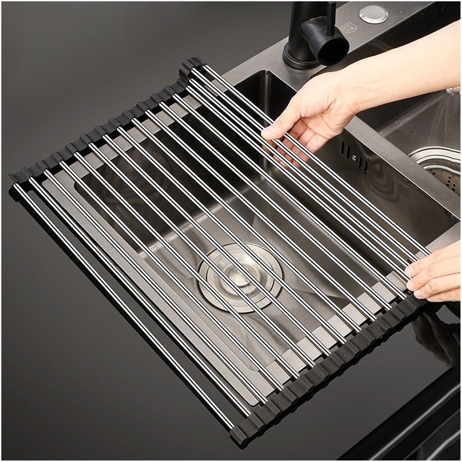 Our foldable sink drying rack is sturdy, waterproof, and can easily drain water from dishes, vegetables, and fruits. Simply place it above the sink and use it without taking up spaceSpecificationMaterial: Stainless steelSize: L x WColor: Gray, BlackFoldable: YesFeatures1. The expandable roll up drying rack is composed of stainless steel rods and silicone edges, which are sturdy and can be used for a long time2. Foldable stainless steel drainer is waterproof, easy to clean, and can be wiped clean immediately3. The sink dish drying rack features a rollable design for easy storage and organization, without taking up space4. The heat resistant dish drying mats for kitchen counter to place hot bowls, hot pots, bakeware and other kitchen hot stuff5. Convenient sink cover to place chopping and cutting board and prepare food6. Dish drying rack over the sink adjustable for air-drying washed kitchenware like bowls, pans, glasses, cups, plates, cookware and morePackage Include:1 x Roll Up Dish Drying Rack Note:1. Manual measurement, product size may exist 1 ~ 2 cm error2. Due to light, equipment, shooting angle and resolution of the computer, there will be small color difference, in kind prevail3. In order to get a suitable collapsible sink drying rack, please kindly measure your kitchen sink or platform before choose