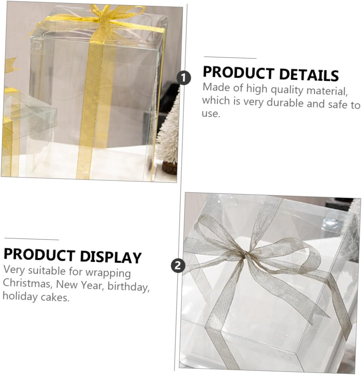 Package Include 5 x cake packaging boxes Characteristics - Material: Food grade white card, PET. - Applicable: for 8 inch cake Cake Packing Case. -Product Info:Birthday Cake Box - Size: 26.00X26.00X25.00cm/10.22X10.22X9.82inch. - Color: White ( color for ribbon). - Use packaging boxes to pack your food to make the display more upscale Square Storage Container. - Suitable for various occasions such as Christmas, shower, bridal shower, wedding, birthday party and anniversary Cake Wrapping Case. - Different sizes that you can choose, choose the most suitable one that can hold your cake just. - Made of , and , which will give you an enjoyable dessert experience. - Can make your cake more delicious and look wonderful Cake Storage Container.Goods DescriptionTransparent Cake Boxes Do you want to pack your dessert with an box? Do you want a multifunctional cake box? , ! Our cake box must meet your needs, it's made of healthy material, and it's to use, and you can put cake or other dessert in it, which will to your