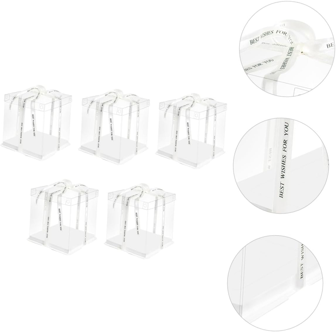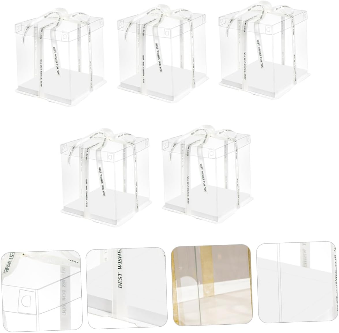 Package List 5 x cake packaging boxes Characteristics - Material: Food grade white card, PET. -Product Info:Birthday Cake Box - Size: 26.00X26.00X18.00cm/10.22X10.22X7.07inch. - Applicable: for 8 inch cake Food Packaging Boxes. - Color: White (Random color for ribbon). - No bad odor, easy to clean, not easy to break, for car travel, outdoor picnics, etc Cake Carrier. - Ribbon design to keep the food sealed and prevent the cover coming off Square Storage Container. - Made of material, which is very and safe to use. - With ribbon for you to carry your cake or other food everywhere Cake Holder. - Very suitable for wrapping Christmas, New Year, birthday, holiday cakes Cake Container.Goods InformationBaking Cake Container This item is a cake carrier, made of and sturdy food grade white card, PET material.Square Storage Container It can be used for refrigerator or kitchen cupboard.Cake Carrier The ribbon design makes this storage organizer more portable and practical.Cake Packing Case Transparent surface helps you see the inner clearly