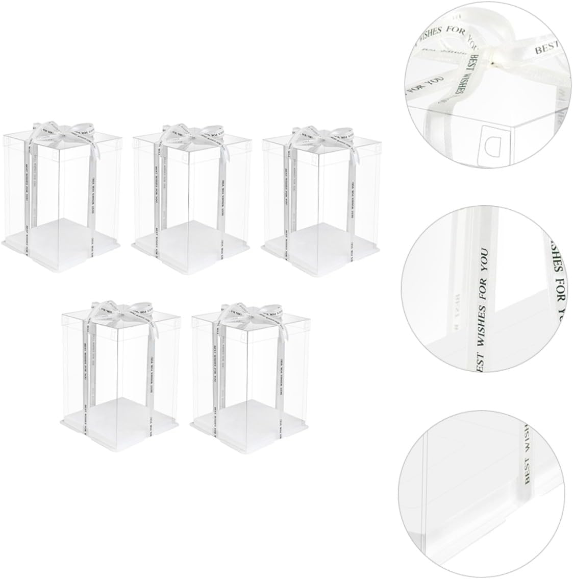 Package Include 5 x cake packaging boxes Characteristics - Applicable: for 8 inch cake Food Packaging Boxes. - Color: White (Random color for ribbon). - Size: 26.00X26.00X25.00cm/10.22X10.22X9.82inch. -Product Info:Birthday Cake Box - Material: Food grade white card, PET. - Ribbon design to keep the food sealed and prevent the cover coming off Cake Container. - Very suitable for wrapping Christmas, New Year, birthday, holiday cakes Transparent Cake Boxes. - No bad odor, easy to clean, not easy to break, for car travel, outdoor picnics, etc Square Storage Container. - With ribbon for you to carry your cake or other food everywhere Baking Cake Container. - Made of material, which is very and safe to use.Goods InformationCake Container Transparent surface helps you see the inner clearly.Transparent Cake Boxes The ribbon design makes this storage organizer more portable and practical.Cake Packing Case This item is a cake carrier, made of and sturdy food grade white card, PET material.Square Storage Container It can be used for refrigerator or kitchen cupboard