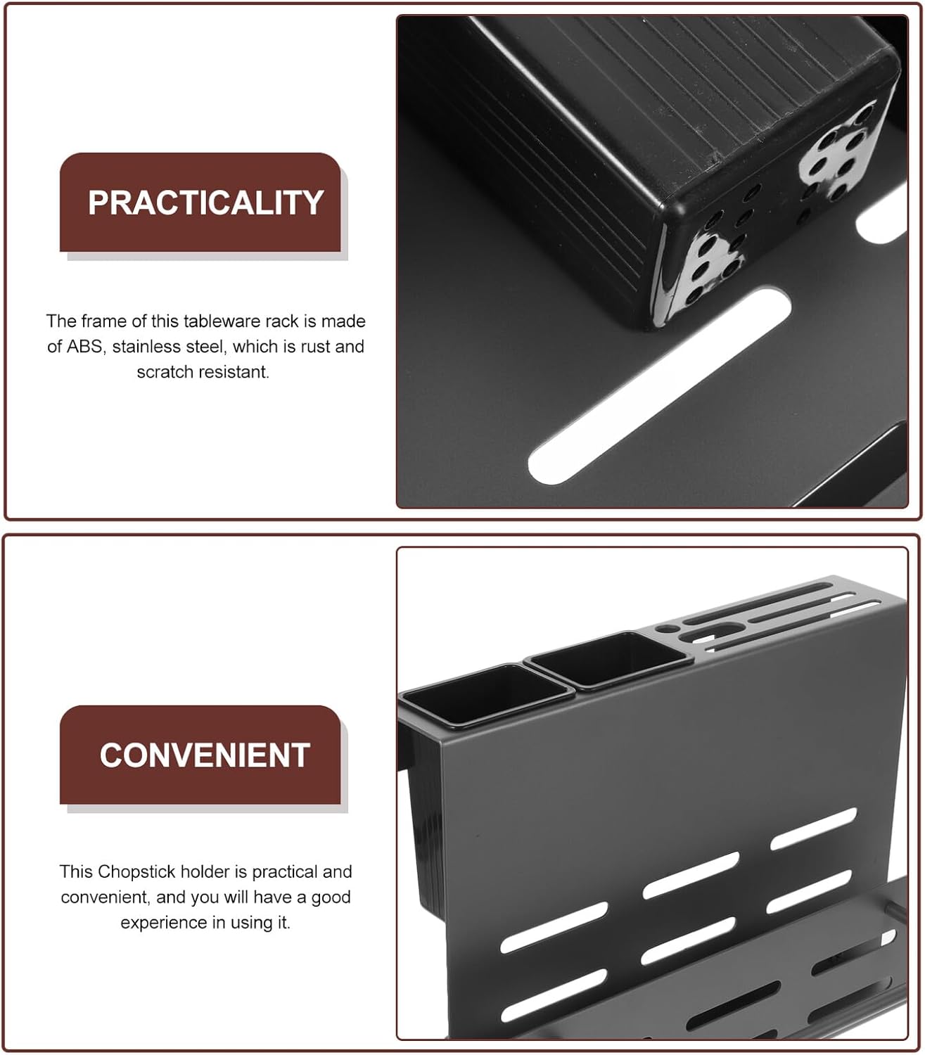Package List 1 x Wall Organizer Features -Size:27.50X20.50X14.50cm/10.81X8.06X5.70in (whole) -Color:Grey -Size:10.30X6.50X5.00cm/4.05X2.55X1.97in (removable tableware holder part) -Material:ABS, stainless steel -Product Info:Wall-mounted tool storage rack -Suitable for storing chopsticks and keeping cooking utensils tidy on the workbench. Very suitable for storing spoons, forks, cutter, cutter board, chopsticks, silverware or other small utensils cutlery chopstick holder. -In a stylish style, it can easily fit into any kitchen and any wall. Let you have a clean kitchen kitchen chopstick holder wall-mounted racks. -Chopstick Holder has a stylish and simple appearance and does not take up too much space chopstick rack. -Very practical and beautiful, for your kitchen rack to add luxury and noble temperament chopstick holder storage. -With the draining holes at the bottom, it is easily discharge water, so that the utensil is no longer wet kitchen wall chopsticks holder.Goods Informationchopsticks container Convenient storage design, surface, the bottom with hole to drain water, beautiful and practical.chopstick storage holder This product is kitchen Chopstick Holder, which is made of ABS, stainless steel material for and practical use.chopstick holder Suitable for storage of spoons and other cutlery.utensil holder for kitchen With beautiful appearance, it will its popularity and practicability