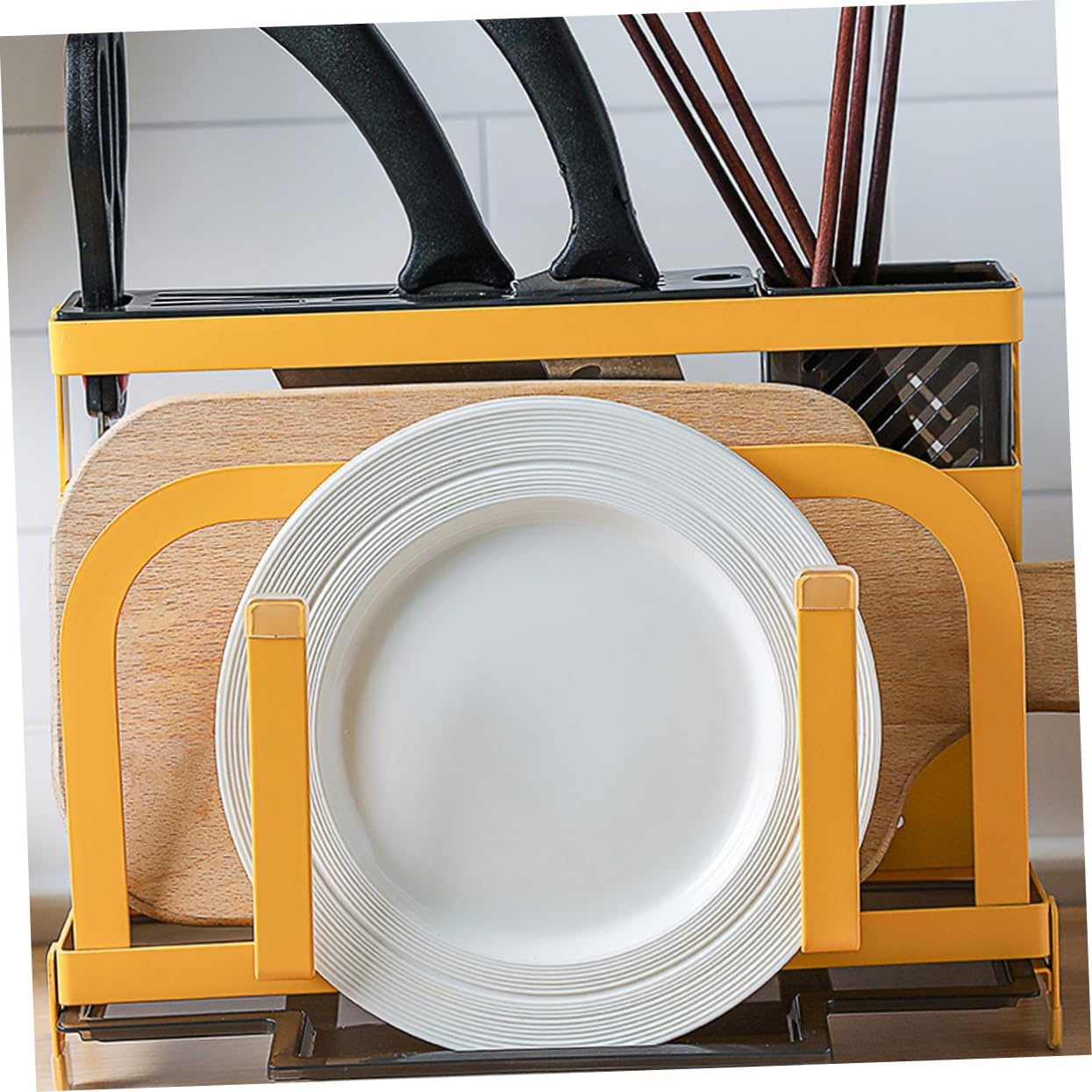 Package Include 1 x Storage Rack Features -Size: About 33.2x25x11.4cm/ 13.07x9.84x4.48 inch Cutting Board Rack. - Material: Iron Cutlery Holder Organizer. - Color: Yellow. - Suitable for kitchen, restaurant, hotel and all kinds of party Holder. - Elegant and space saving design, the holder rack is easy to clean and maintain Cutting Board Storage Shelf. - Made of material for lasting use Rack. - With anti-slip design, and cutting board won't fall off. - Multiple slot design offers a place for your and cutting board to stay firmly and sturdy enough and won't tip over.Goods InformationCutting Board Storage is suitable for kitchen, restaurant, hotel and all kinds of party.Cutting Board Rack The item is iron cutting board holder, which is for putting cutting board, and chopsticks.Holder With elegant and space saving design for modern kitchens, the holder rack is easy to clean and maintain
