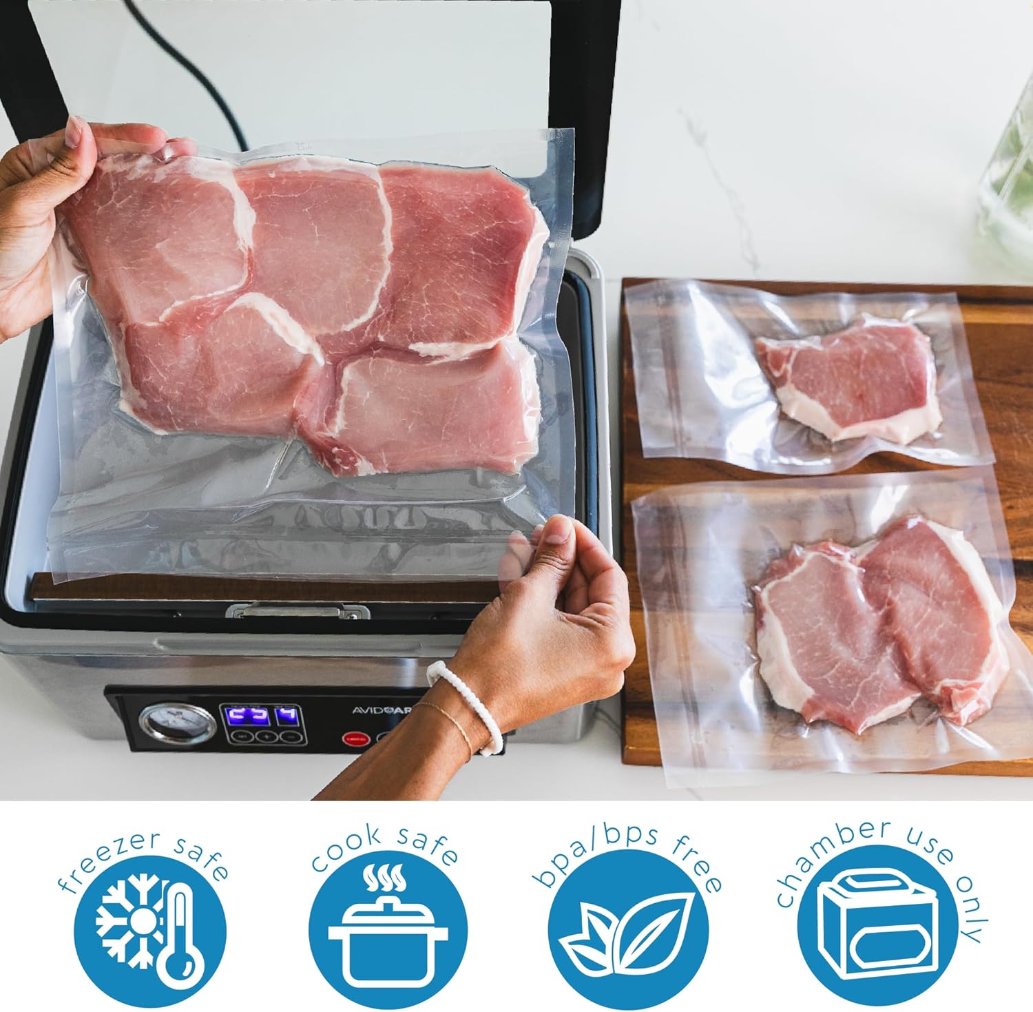 Introducing Avid Armor's ultimate solution for food preservation and appliance protection: the Assorted Size Pack of 300 Chamber Vacuum Pouches, designed to keep your food fresh, flavorful, and perfectly preserved. This versatile pack includes 300 BPA-free pouches in three practical sizes—100 each of 6"x10", 8"x10", and 11"x10"—ideal for various food types, from large cuts of meat to individual snacks. With a premium thickness of 3.5 mil, these pouches protect against freezer burn and external contaminants, ensuring long-lasting freshness. They are designed for versatile cooking options, accommodating microwaving, boiling, simmering, and sous vide methods. To complement this, the Avid Armor USV20 Dust Cover is made from durable Oxford fabric and features a reversible design, allowing you to choose between a professional or understated look. This easy-to-use cover keeps your vacuum sealer dust-free and protected from spills while being machine washable for effortless cleaning. Together, this bundle offers a cost-effective and eco-friendly solution, ensuring both your food and appliances remain in top condition. Elevate your kitchen experience today with Avid Armor—your trusted partner for quality and reliability!