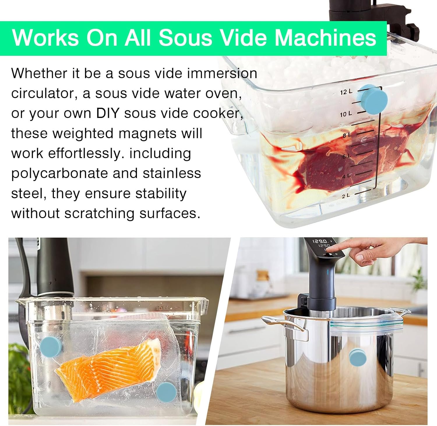 Package Includes: · 10pcs 8.6"x8.2" vacuum seal bags · 10pcs 10.2"x13.3" vacuum seal bags · 4pcs cooking clips · 2pcs zipper clips · 1pcs upgraded electric vacuum pump · 12pcs silicone-coated magnetic clips Key Features: · Upgraded Electric Pump: Simplifies the sous vide process with efficient air removal and secure sealing. · Premium Vacuum Bags: BPA-free and reusable, they extend food freshness and are easy to clean and reuse. · Magnetic Clips: Silicone-coated magnets ensure full bag submersion, even cooking, and are compatible with various containers. · Versatile Use: Ideal for preserving a wide range of foods, from snacks to meats and seafood, both at home and on the go. · Safety and Durability: The heat-resistant materials ensure safe cooking, while the compact design of the clips makes storage easy and space-efficient. Effective Tips for Using Our Vacuum Bags: · Keep bags away from children to avoid suffocation hazards. · Suitable for dry foods and some foods with a bit of liquid, but clean the valve after use. · Store bags in a dry, cool, and well-ventilated area. · Wash bags with soap and water; avoid using a dishwasher. · Ensure the zipper is closed tightly and avoid folding to prevent damage. Convenient and Reliable: Our sous vide kit provides everything you need for a seamless cooking experience, whether you’re a beginner or an experienced chef. Enjoy perfectly cooked meals and extended food freshness with MOMODA's comprehensive sous vide cooking solution.