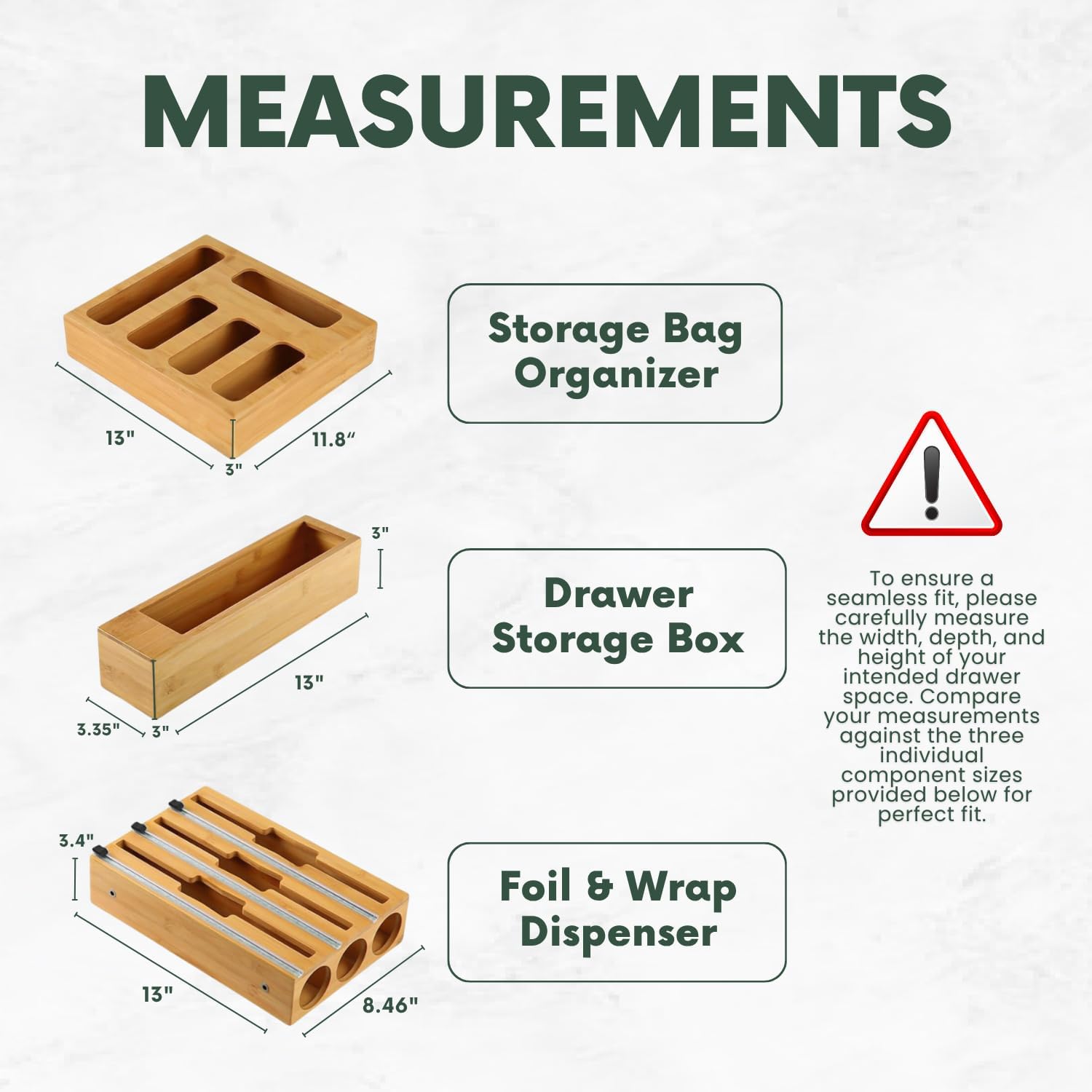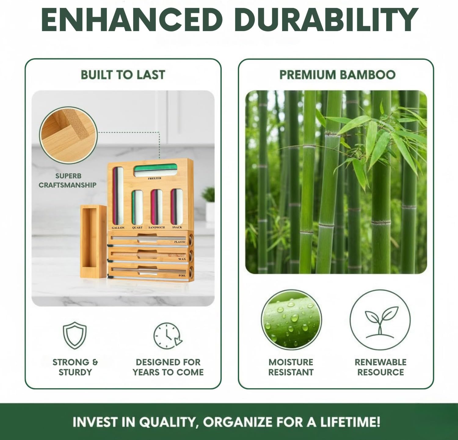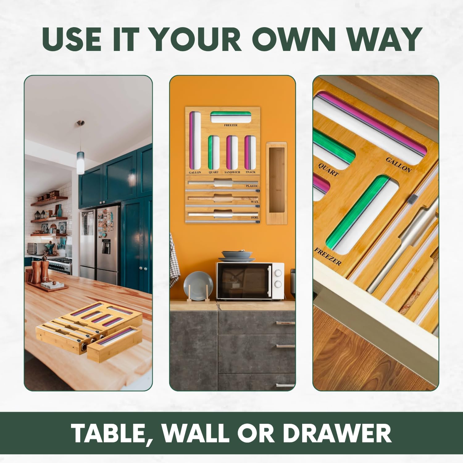 This organizer is designed to hold multiple sizes of storage bags, including gallon, quart, sandwich, and snack, along with foil and plastic wrap, all in one easy-to-use drawer system. It helps remove clutter and makes your daily kitchen routine more efficient. Crafted from high-quality natural bamboo, this organizer is built for strength and long-term use. The solid bamboo construction resists bending and cracking while adding a warm, premium look to your kitchen drawers. Its smooth surface is easy to clean and safe for everyday handling. The compact and slim design fits most standard kitchen drawers without taking up extra space. Equipped with built-in slide cutters, this organizer allows you to cut foil and plastic wrap smoothly and evenly every time. The cutters are safely hidden, helping reduce waste and preventing jagged edges. Refilling the rolls and storage bags is quick and simple, with no tools or complicated steps required. Designed for easy access, all compartments are clearly laid out so you can quickly find the size you need. This saves time during meal prep, lunch packing, and food storage. Everything stays visible and within reach, reducing frustration and mess. Ideal for families, busy kitchens, apartments, and RVs, this 9-in-1 drawer organizer improves organization while keeping your kitchen looking clean and tidy. It is a smart, space-saving choice for anyone who values a well-organized kitchen and stress-free daily use.