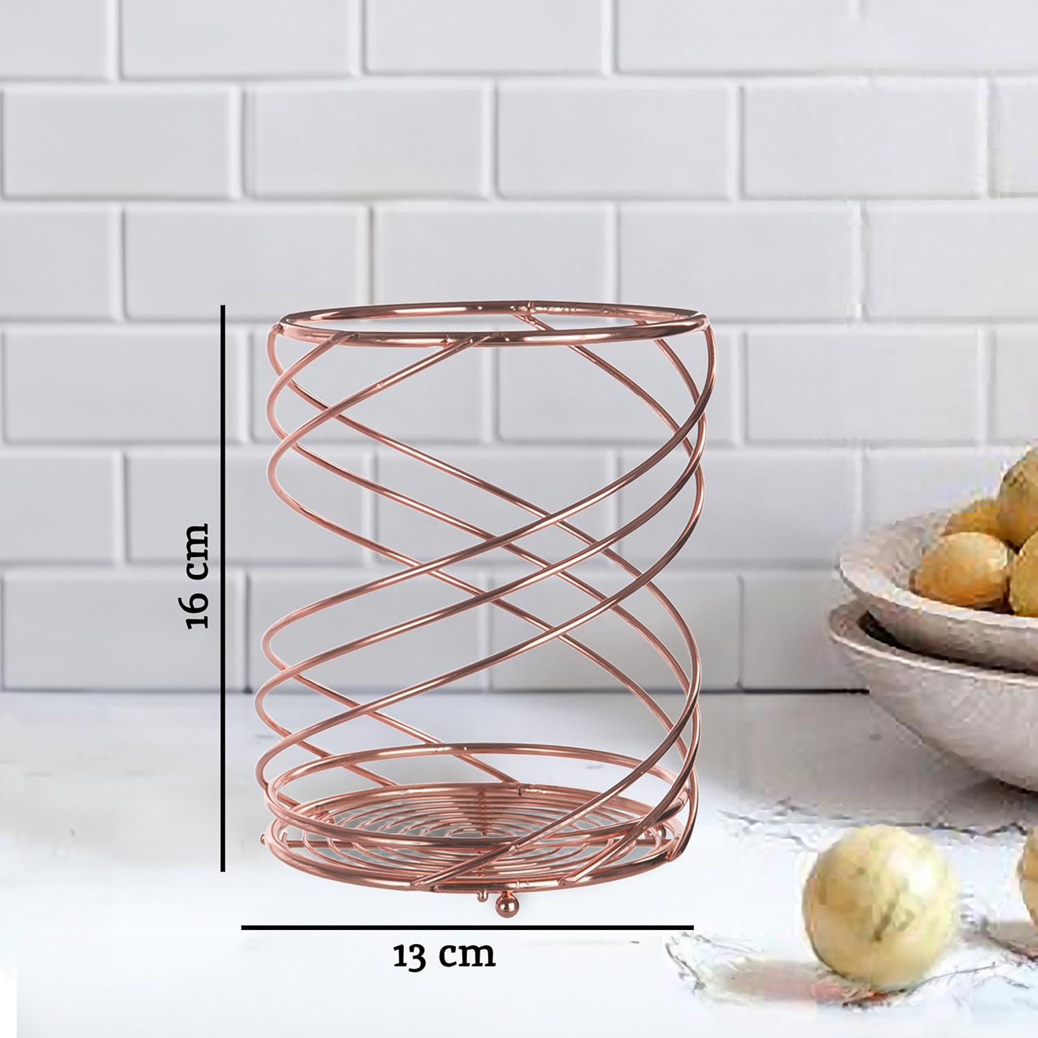 Keeping your kitchen organised and tidy in style, the beautifully designed Kuper utensil holder provides a wonderful storage solution for your everyday kitchen tools. Made from robust metal wire, the holder is effortlessly shaped to create a sweeping cylindrical design, while the rose gold finish helps to accentuate the contours. The round holder has ample space for keeping your utensils close to hand when cooking, and your drawers clutter free. 3 small ball feet ensure the holder is stable at all times. Adding a glamorous touch to any setting, the Kuper utensil holder will ensure a tidy space for a better looking kitchen.