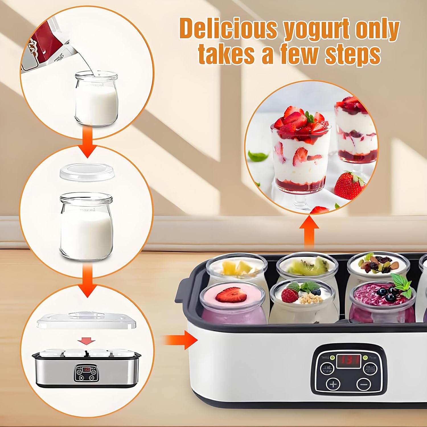 Introducing our Automatic Yogurt Maker with LCD Display, a versatile 1400ML fermenter designed for yogurt enthusiasts and health-conscious individuals alike. This user-friendly yogurt machine allows you to create delicious homemade yogurt and cheese effortlessly. With its 8 included cups, you can easily prepare different flavors or share with family and friends. Our yogurt maker features advanced auto temperature control and an adjustable timer ranging from 0 to 48 hours, ensuring perfect fermentation every time. Whether you're crafting a creamy Greek yogurt or a dairy-free alternative, this machine accommodates a wide variety of recipes, making it ideal for both men and women looking to incorporate healthy options into their diet. The durable plastic construction is designed for longevity, while the sleek silvery color adds a modern touch to your kitchen. With a power consumption of just 25W and a voltage range of 110-240V, it's energy-efficient and perfect for any household. Imagine the satisfaction of enjoying homemade yogurt, knowing exactly what goes into it. This yogurt maker not only saves you money compared to store-bought options but also allows you to customize flavors and ingredients to suit your taste. Plus, with easy setup and straightforward operation, you'll be enjoying fresh yogurt in no time. In addition to the yogurt maker, you'll receive 8 yogurt jars and lids for convenient storage, along with a user manual to guide you through the process. Elevate your culinary skills and embrace a healthier lifestyle with our Automatic Yogurt Maker, your new kitchen companion for delightful dairy creations.