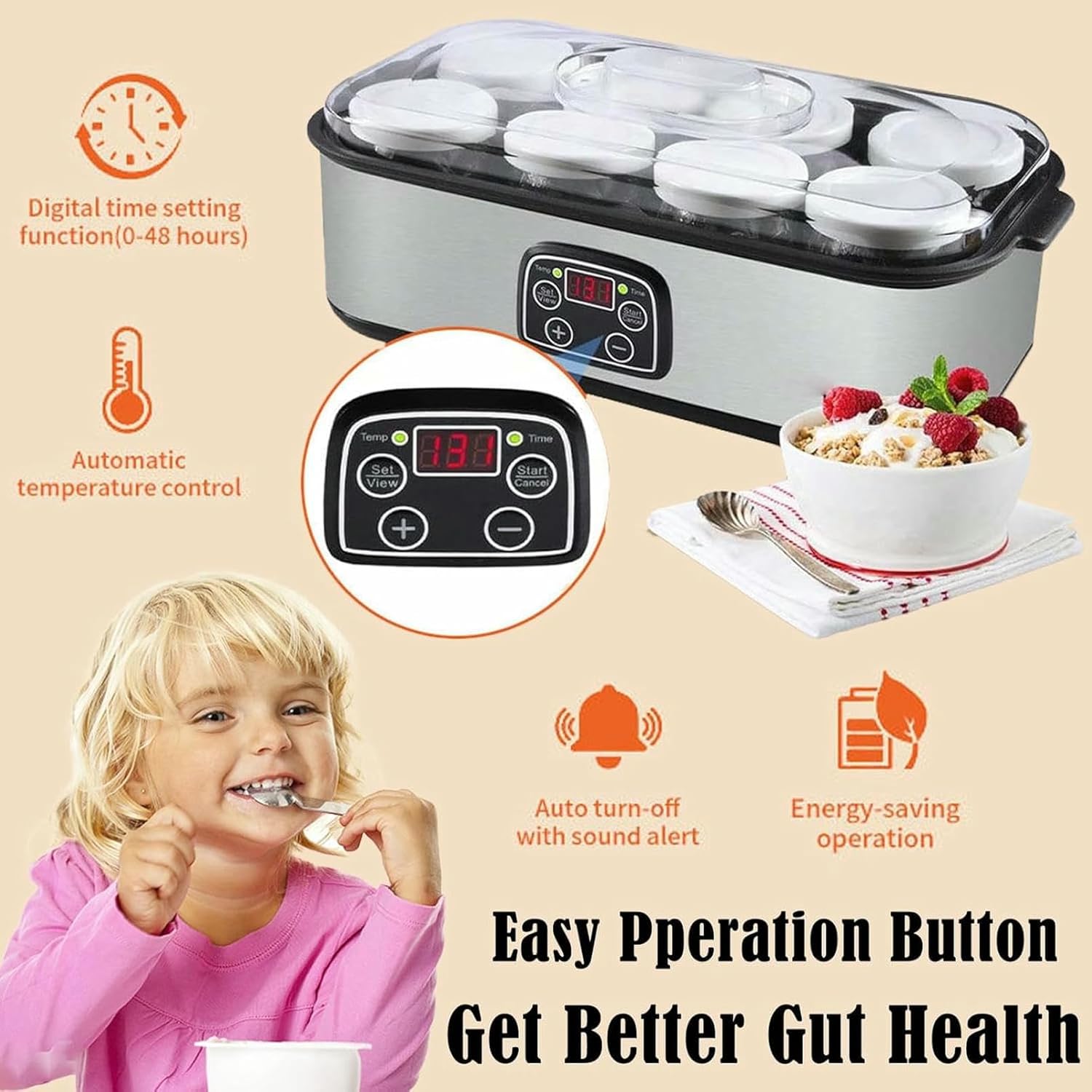 Adjustable Temperature Electric Stainless Steel Yogurt Machine, with 8 Compact Yoghurt Pots, for Fresh Healthy Homemade Desserts